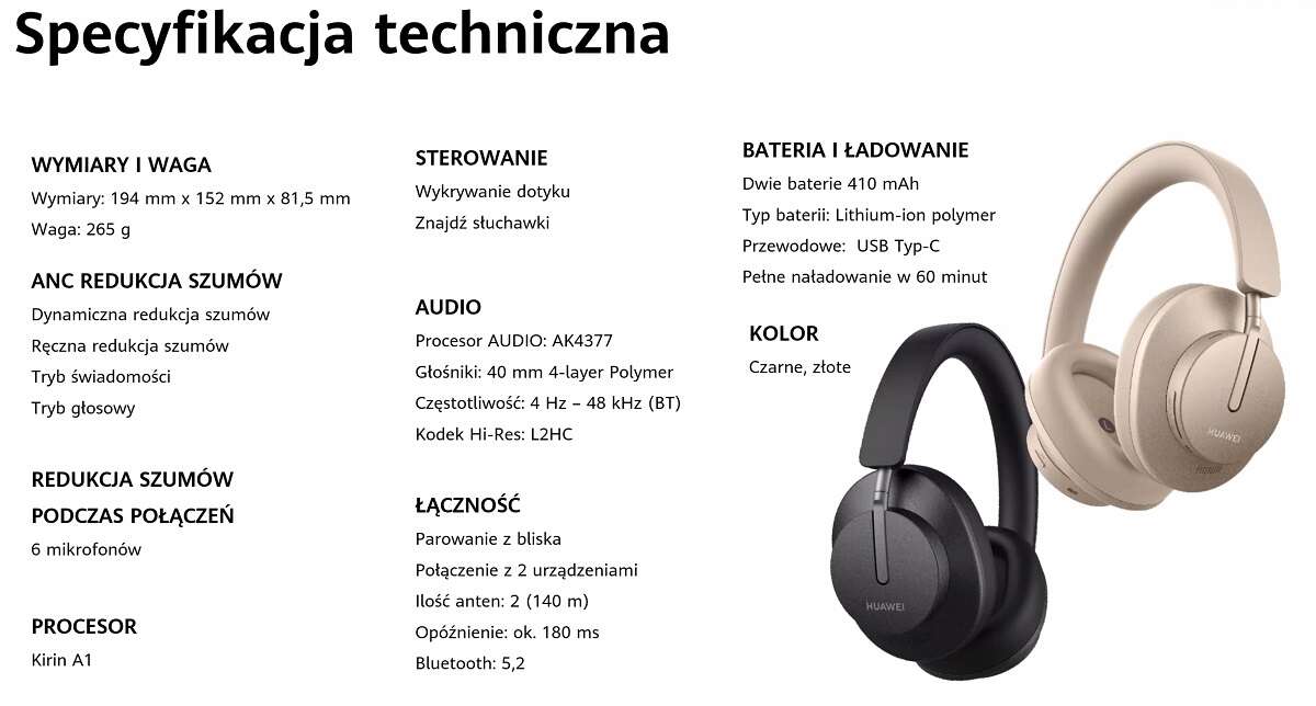 Jeśli chodzi o technikalia to FreeBuds Studio oferują pasmo przenoszenia 4 – 48 kHz i ANC ze skutecznością 40 dB. Redukcja szumu działa inteligentnie, dopasowując jej nasilenie do głośności dźwięków otoczenia. Nie zabrakło też możliwości wpuszczania do słuchawek dźwięków otoczenia w trybie Świadomość. Huawei chwali się też podwójną antenę zapewniającą wielokierunkowy zasięg Bluetooth nawet w trudnych warunkach. Warto też wspomnieć o możliwości jednoczesnego podłączenia słuchawek do dwóch urządzeń i przełączania się pomiędzy nimi.