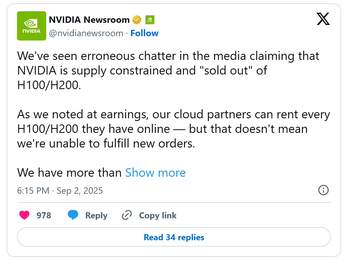 W ostatnich dniach w branży pojawiły się doniesienia o rzekomych brakach kart Nvidia H100 i H200, napędzonych przede wszystkim komentarzem CEO firmy, Jensena Huanga, podczas konferencji wynikowej. Szef Nvidii wspominał wtedy o „ogromnym popycie” i „sprzedanych do ostatniej sztuki” akceleratorach Hopper, co natychmiast podchwyciły media branżowe. Teraz jednak firma oficjalnie zaprzecza tym informacjom, twierdząc, że dostępność układów jest w pełni wystarczająca.