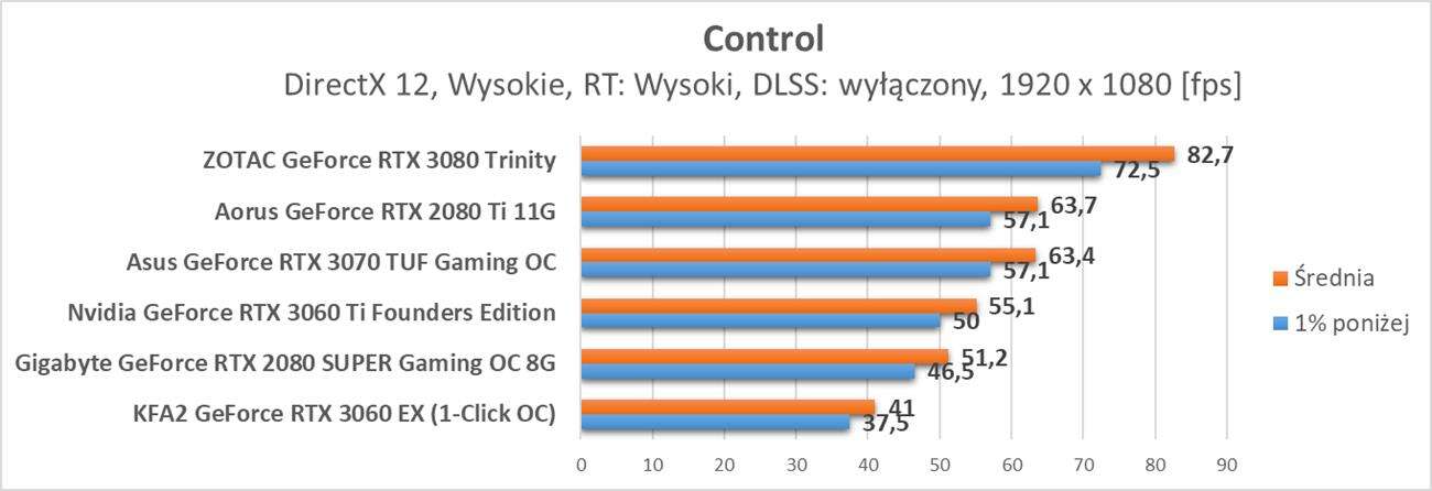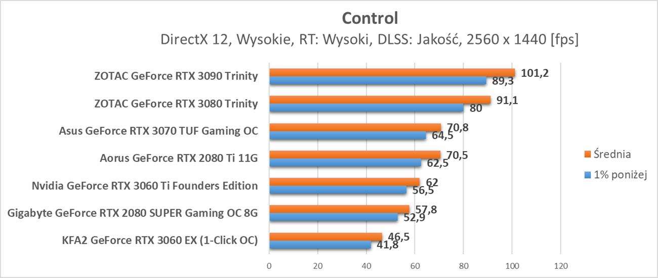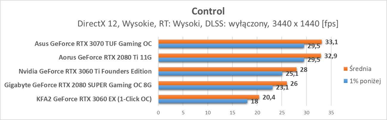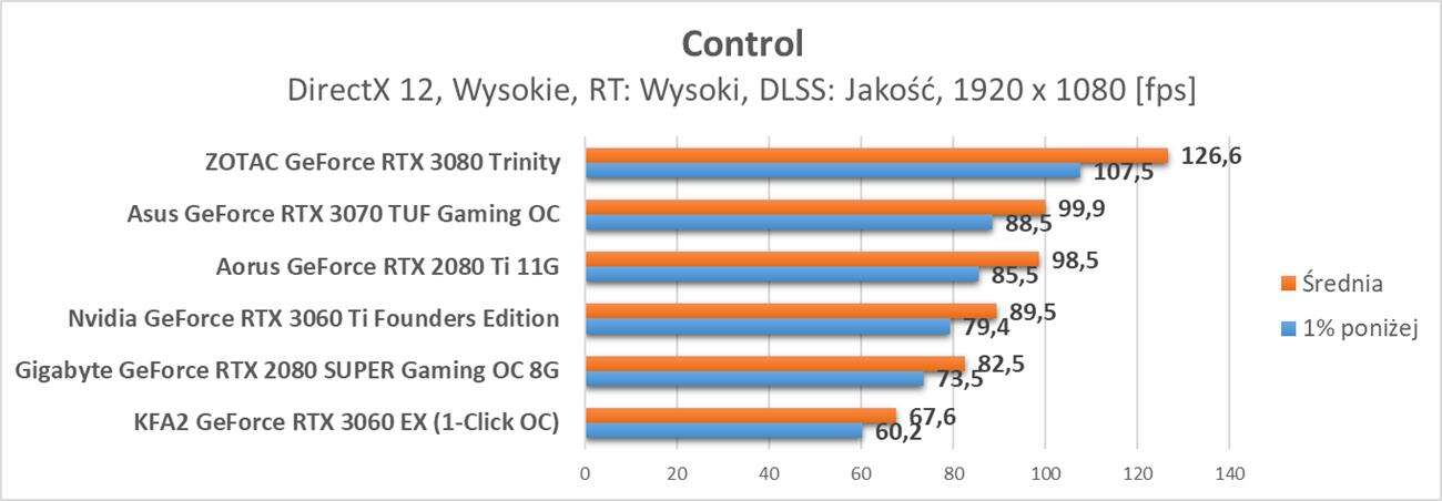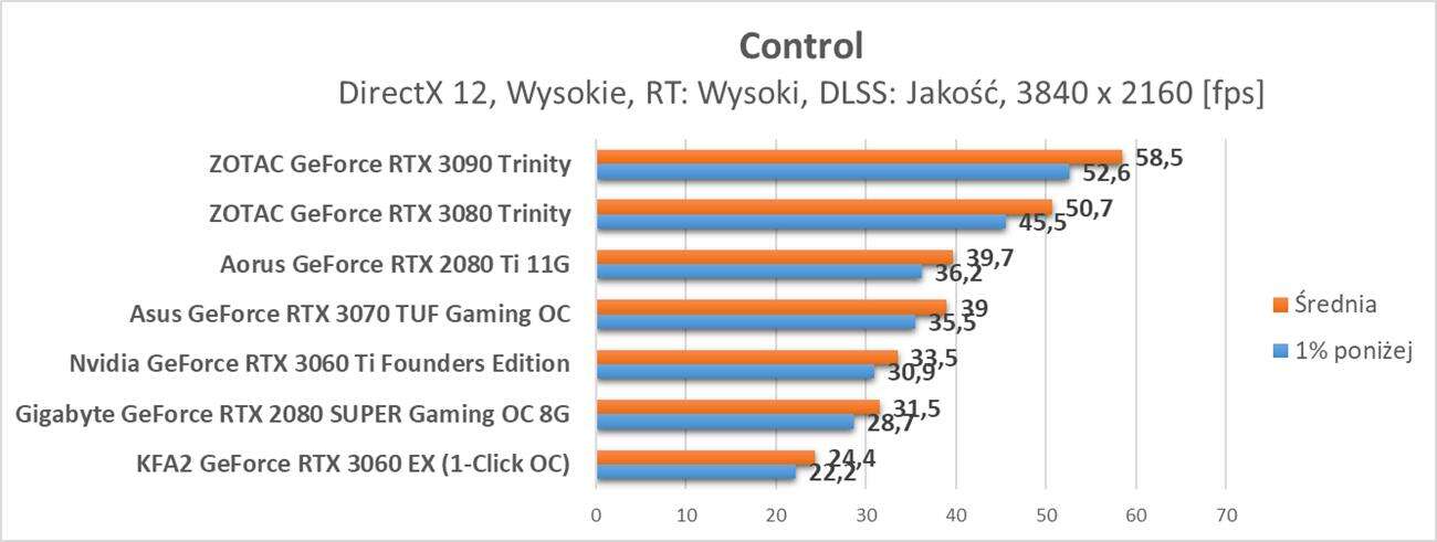 Control to już znacznie bardziej wymagający tytuł. Bez DLSS nawet w Full HD GeForce RTX 3060 nie zapewnia średnio 60 fps. Po jego włączeniu w trybie Jakość jedynie w tej rozdzielczości możecie liczyć na średnio 60 fps. W wyższych rozdzielczościach klatki na sekundę mocno spadają i bez DLSS w innych trybach nie ma co do Control podchodzić.