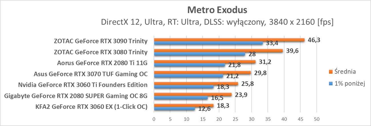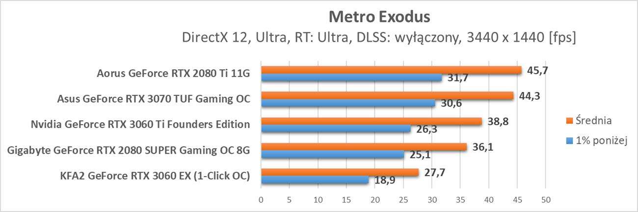 W Metro Exodus po włączeniu DLSS karta nie uzyskuje średnio 60 fps nawet w Full HD. W kolejnych rozdzielczościach jest tylko gorzej i tytuł staje się praktycznie niegrywalny. Nie wspominam tutaj o DLSS, bowiem jest to jego pierwsza implementacja, która nie jest zbyt udana.