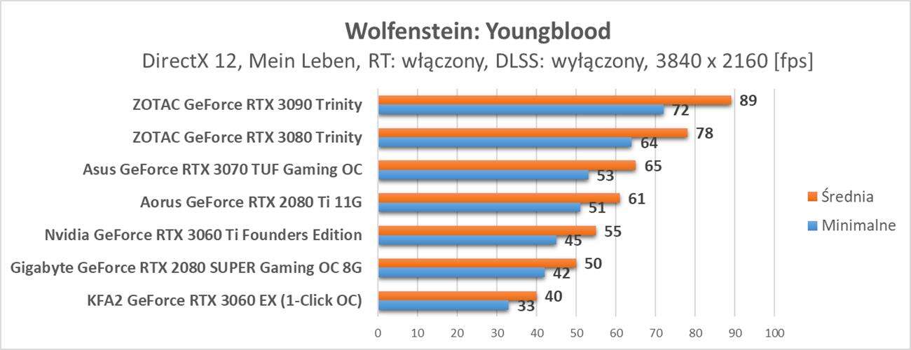 W pierwszej z gier karta poradziła sobie całkiem nieźle. Wolfenstein: Youngblood nie jest zbyt wymagający i nawet w 4K po włączeniu DLSS GeForce RTX 3060 uzyskuje średnio 60 fps. W niższych rozdzielczościach do uzyskania tej magicznej liczby nie trzeba nawet włączać DLSS.