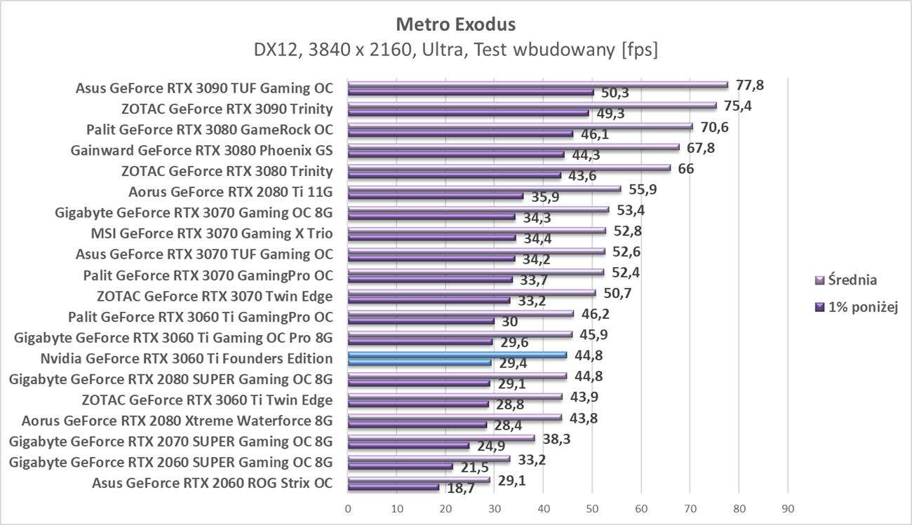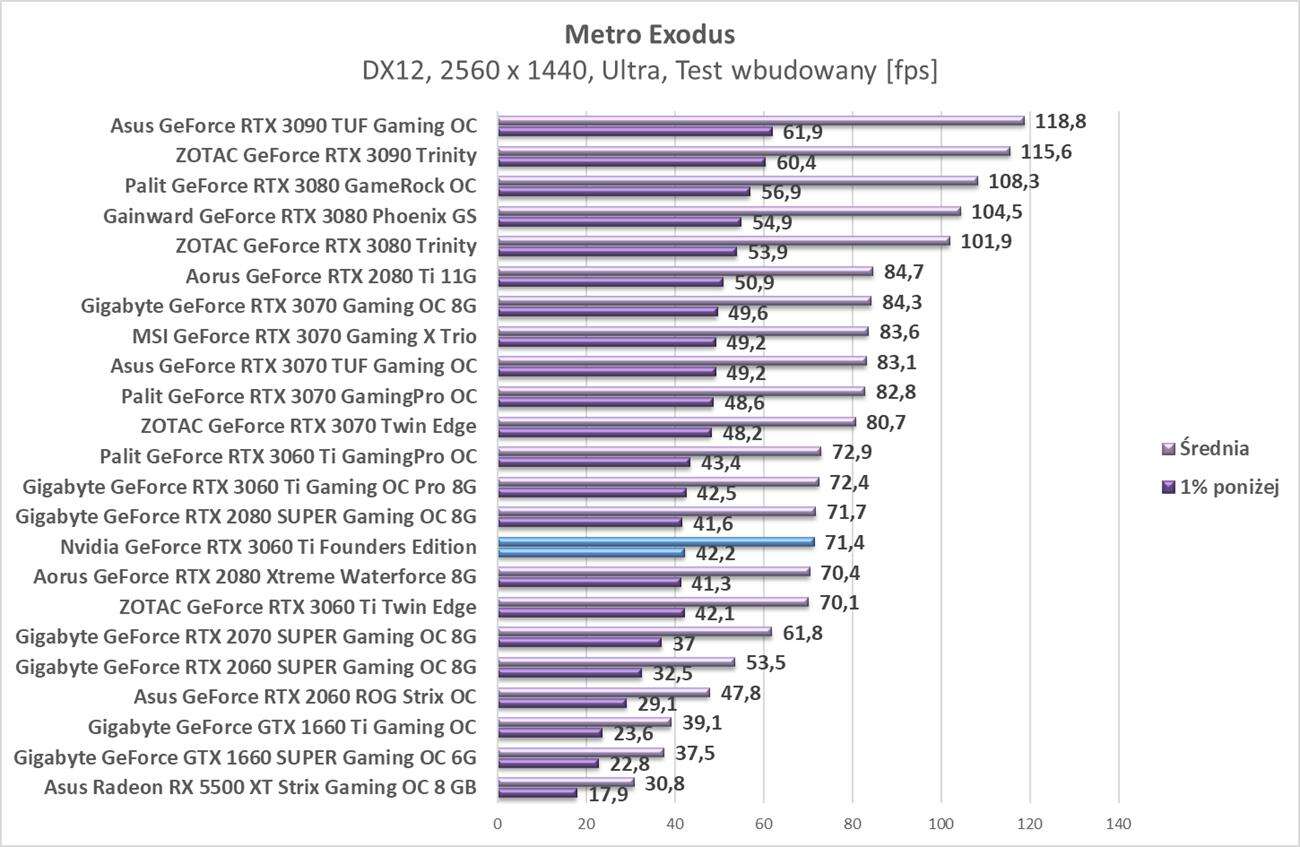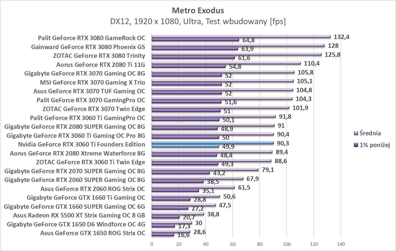 Nvidia GeForce RTX 3060 Ti Founders Edition nie została oczywiście fabrycznie podkręcona. Natomiast w benchmarku Metro Exodus 2560 x 1440 px karta miała średnie taktowanie równe ok. 1920 MHz.