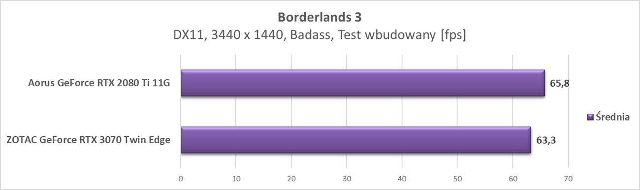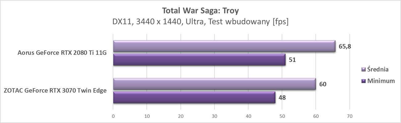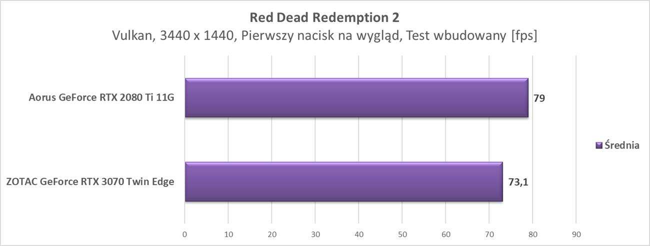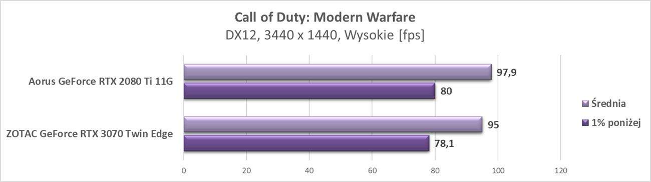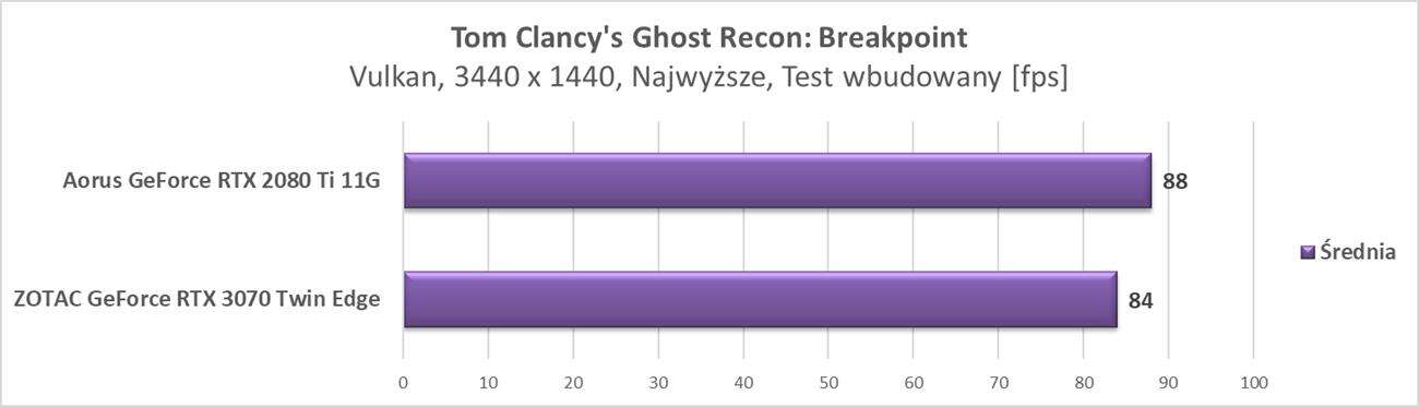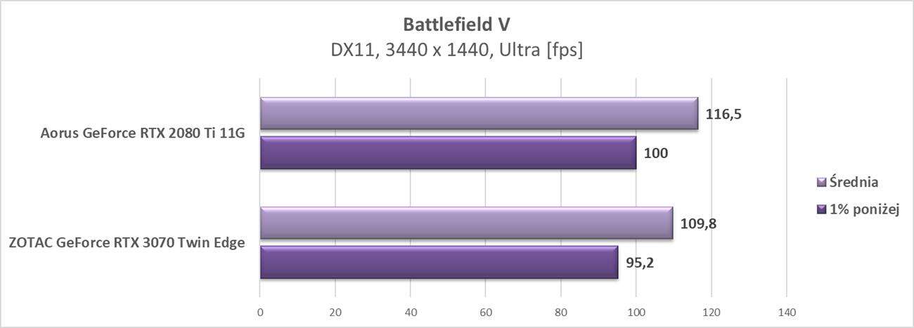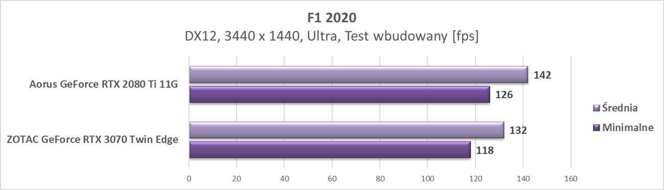 Wyniki pokazują, że karta świetnie spisuje się w tej rozdzielczości. We wszystkich grach osiągnęła ona średnio przynajmniej 60 fps. Wyniki trochę odstają od RTX 2080 Ti, ale tak jak na wstępie wspomniałem – wersja od Aorusa jest mocno podkręcona, a RTX 3070 od ZOTACa nie ma fabrycznego OC.