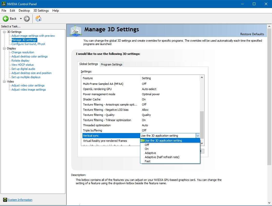 W sterownikach w ustawieniach globalnych możecie zobaczyć małe logo Nvidia obok ustawień V-Sync. Oznacza ono „Użyj ustawienia aplikacji 3D” i to właśnie ono jest domyślnym ustawieniem.