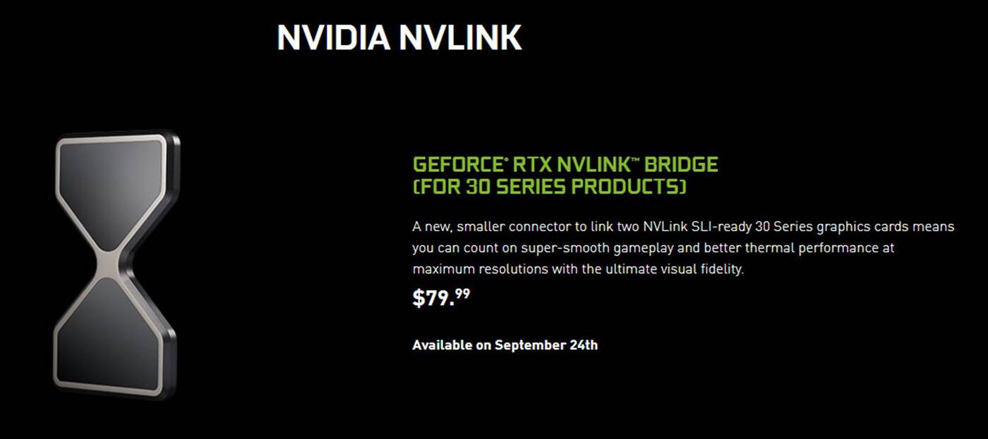 Okazuje się, że jedyną kartą obsługującą NVLink SLI w najnowszej generacji kart NVIDIA będzie RTX 3090, która na dodatek będzie wymagać nowego mostka NVLink, który kosztuje 79 dolarów. Dla przypomnienia, wcześniej kompatybilność z tym łączeniem ze sobą kart oferowały modele RTX 2070 Super, RTX 2080 Super, RTX 2080 i RTX 2080 Ti.