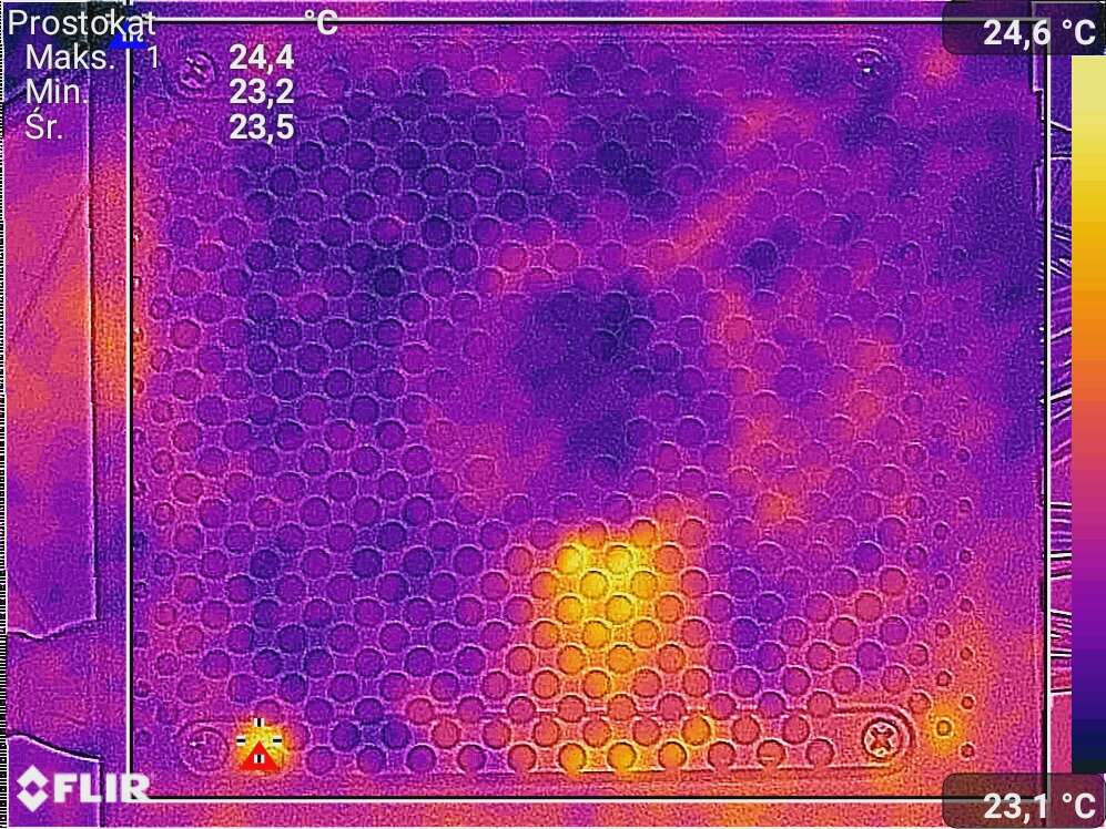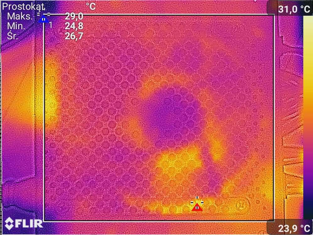 W testach temperatury wykorzystałem moduł termowizyjny smartfonu CAT S61. Zasilacz wypadł świetnie w testach. Napięcia pod obciążeniem bardzo mało różnią się od tych w spoczynku, co jest znakomitym wynikiem. NZXT C650 jest też cichy pod obciążeniem. Przy włączonym trybie półpasywnym z pewnością nie musicie się martwić o jego kulturę pracy. Sprawność jest również bez zarzutów. NZXT C650 ma odznaczenie 80 Plus Gold. Dla obciążenia 20% sprawność wynosi 87%, dla 50% – 90%, a dla 100% – 87%.