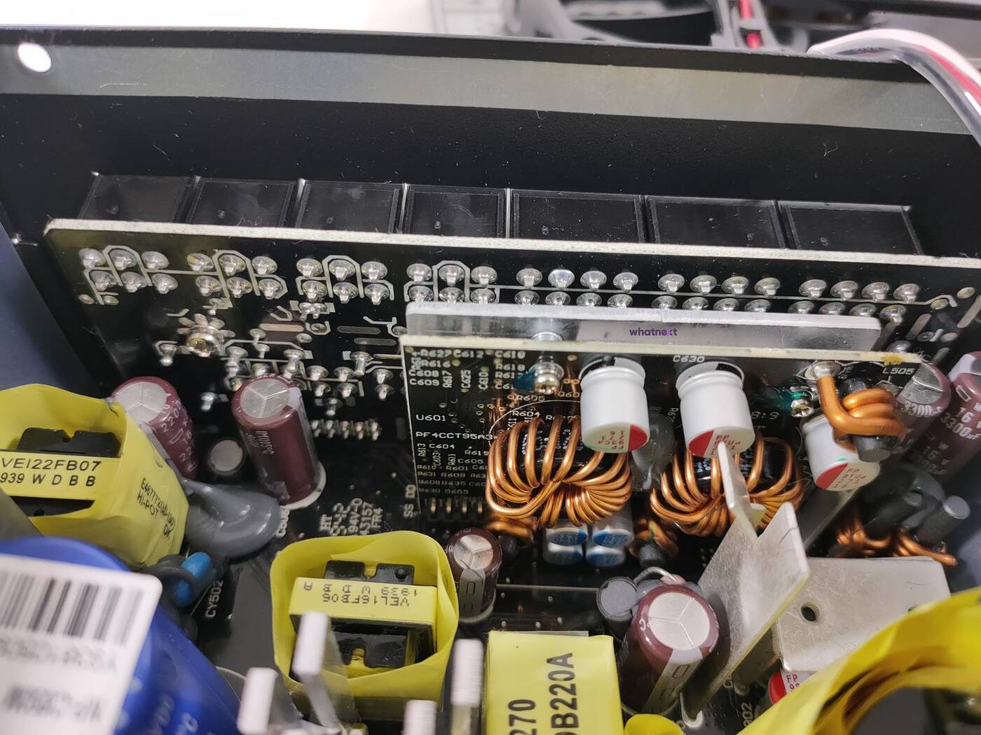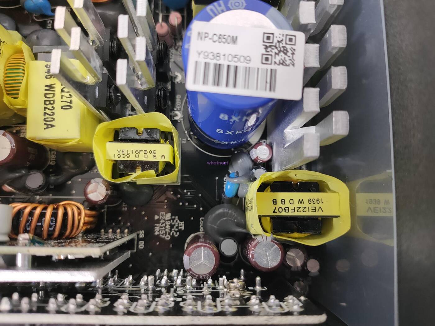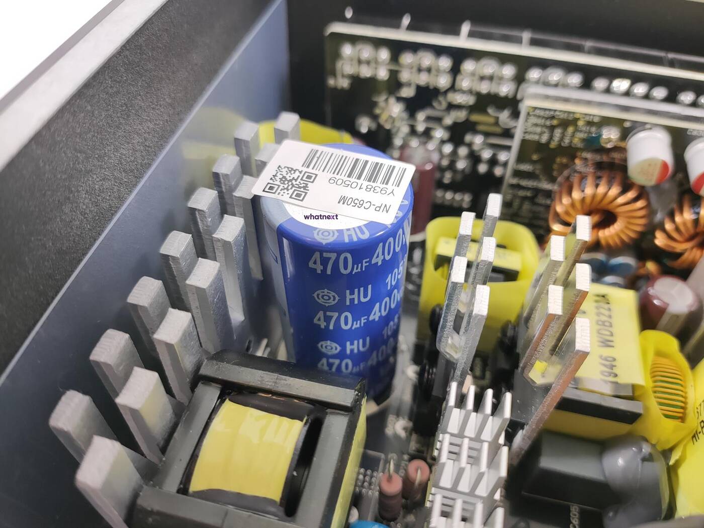 Samo wnętrze zaprojektowane jest przez SeaSonic, mowa więc o bardzo wysokiej jakości. Największy kondensator ma parametry 470 uF, 400 V i może pracować w temperaturze do 105°C. Zasilacz ma oczywiście aktywne PFC. Co ciekawe producent nigdzie nie wspomina o zastosowanych zabezpieczeniach, ale z pewnością jest to OVP, UVP, OTP czy SCP.