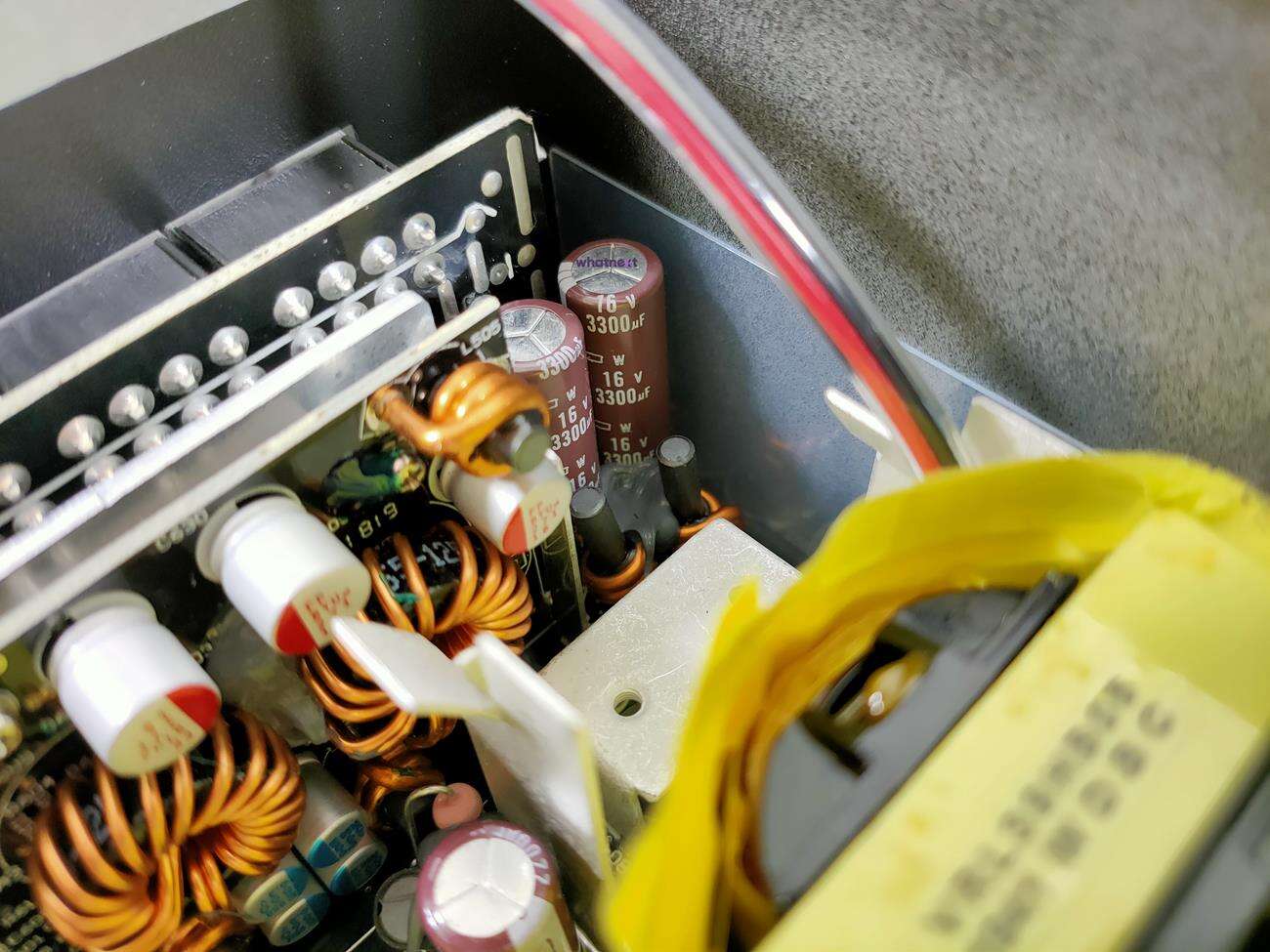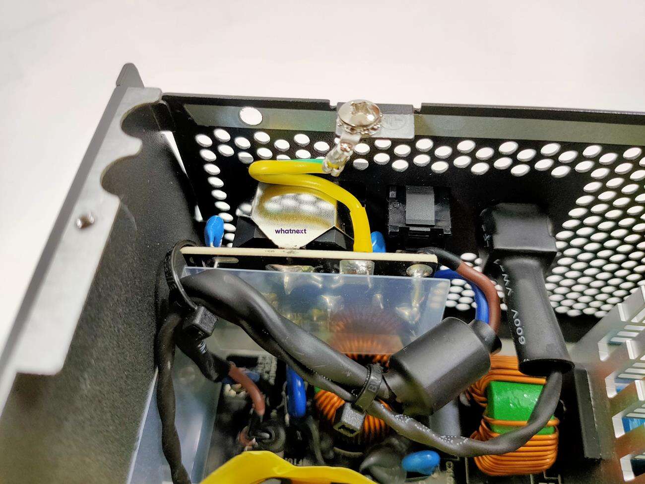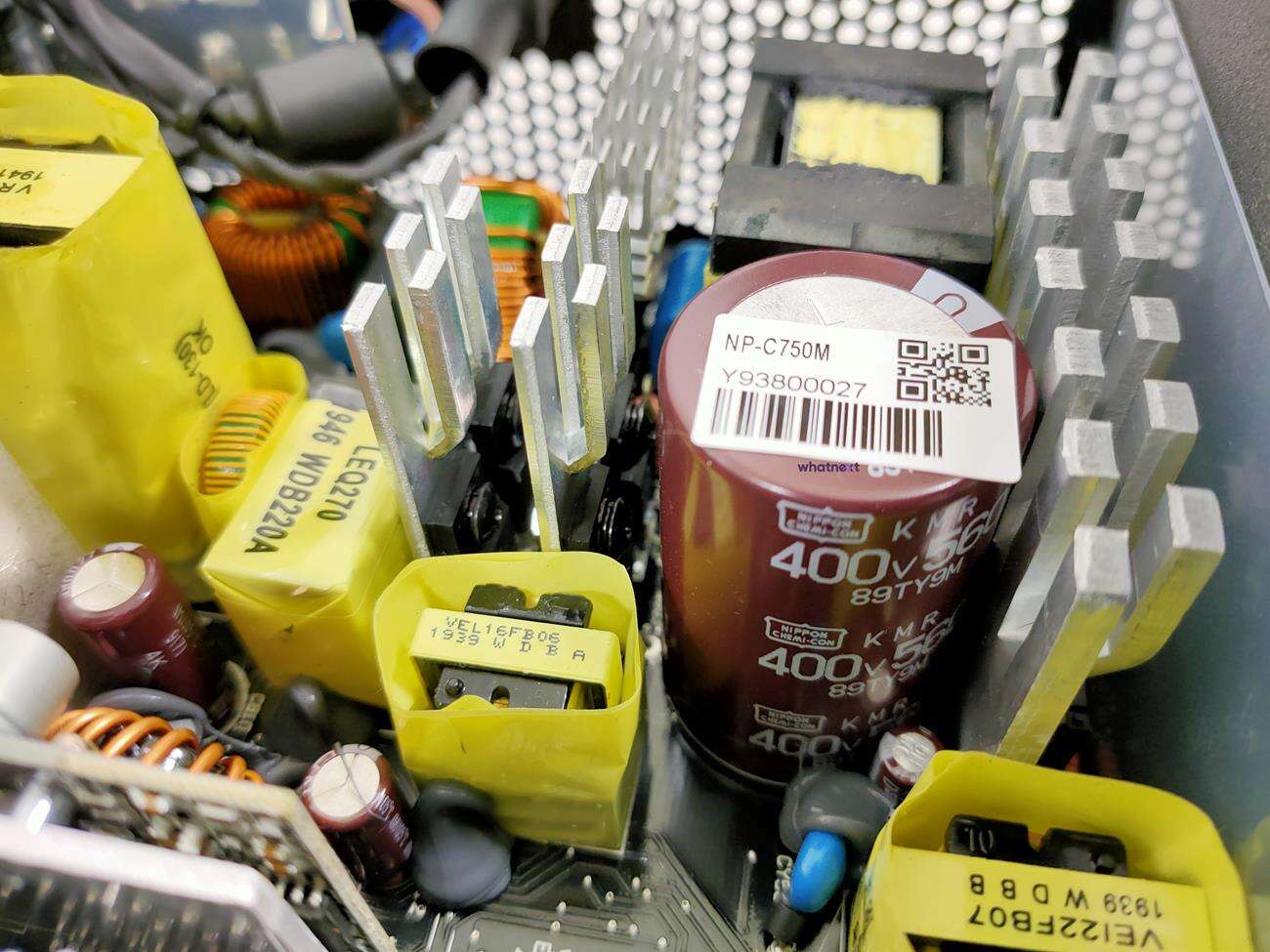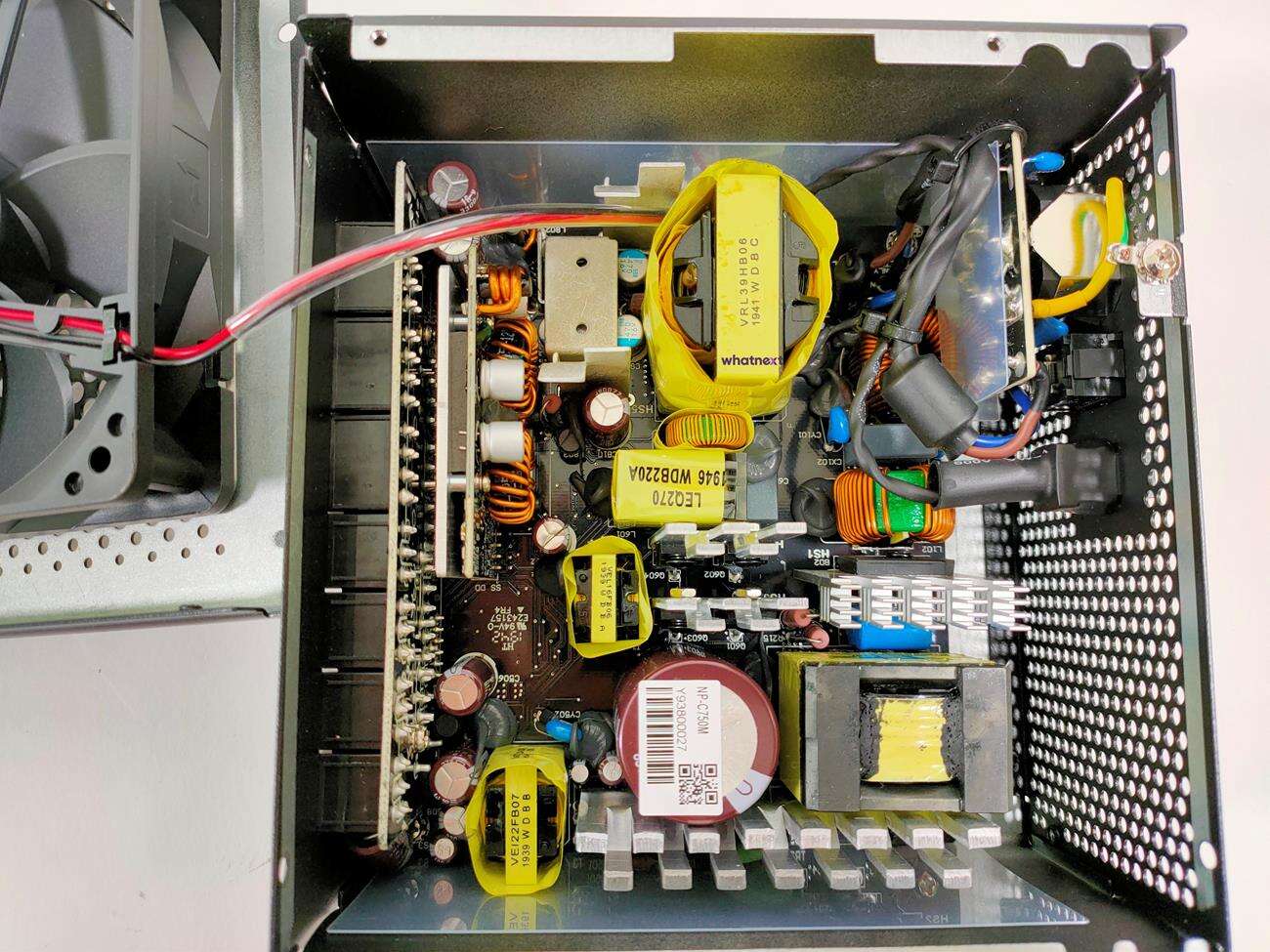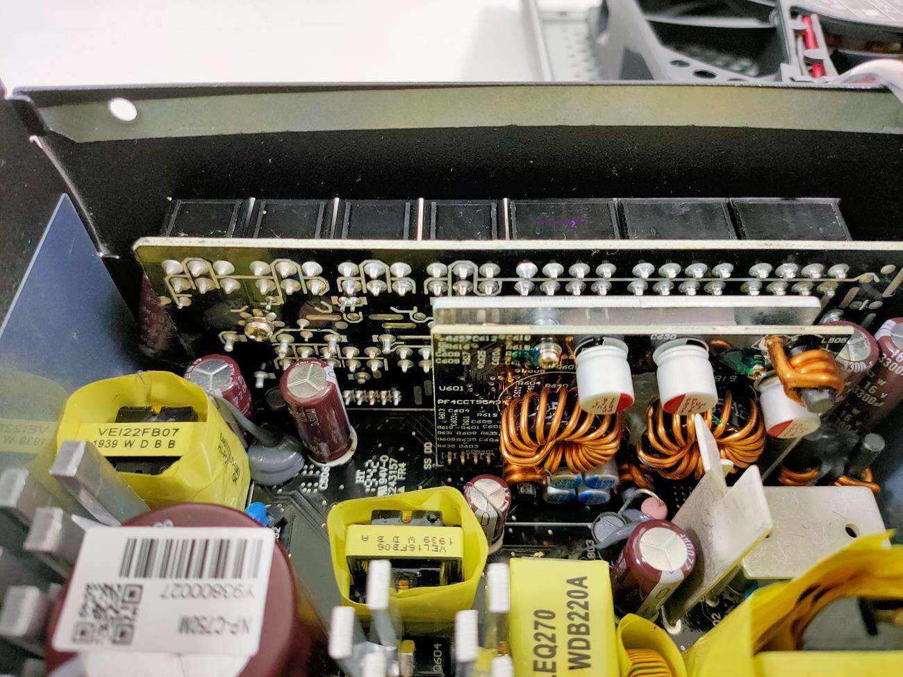 Wnętrze zaprojektowane jest przez Seasonic – jest wiec wysokiej klasy. Największy kondensator ma parametry 400 V, 560 uF i może pracować w temperaturze do 105°C. Zasilacz ma aktywne PFC. Producent nigdzie nie wspomina o zastosowanych zabezpieczeniach, ale na pewno mowa jest o OVP, UVP, OTP czy SCP.