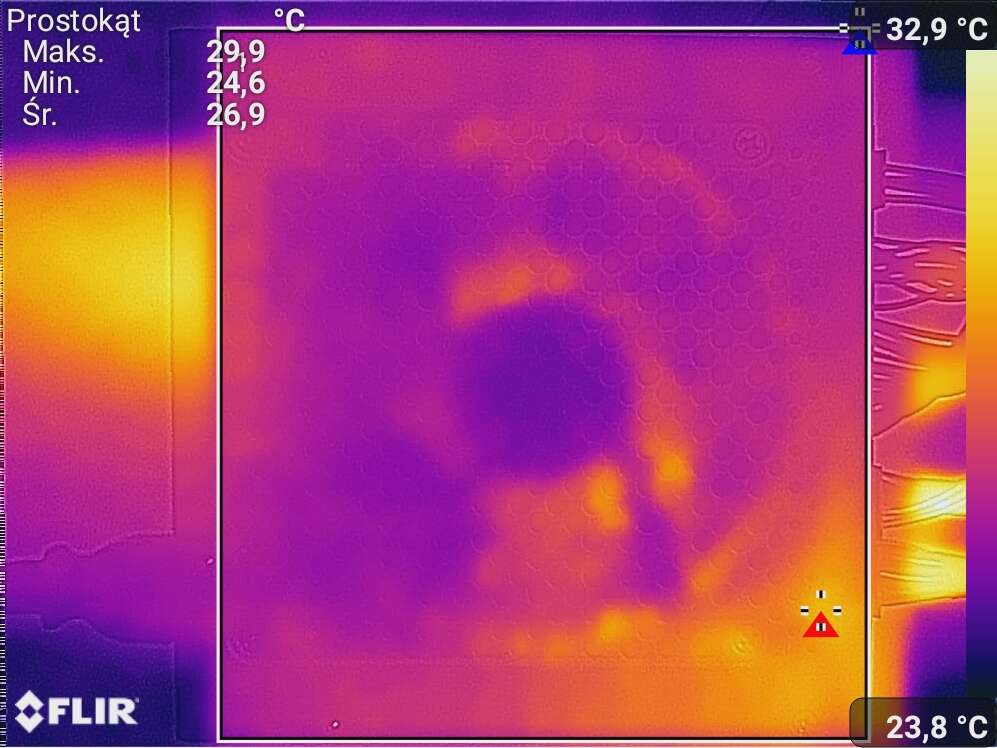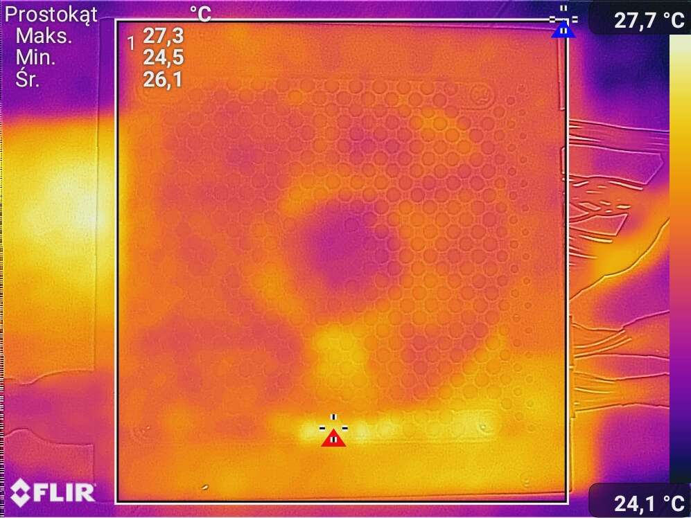 Spoczynek polegał tylko na wyświetlaniu pulpitu. Obciążenie to FurMark + Cinebench R23. W testach temperatury wykorzystałem moduł termowizyjny smartfonu CAT S61.