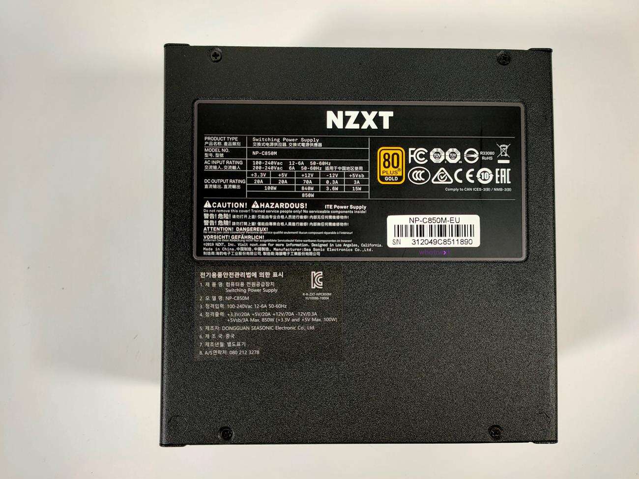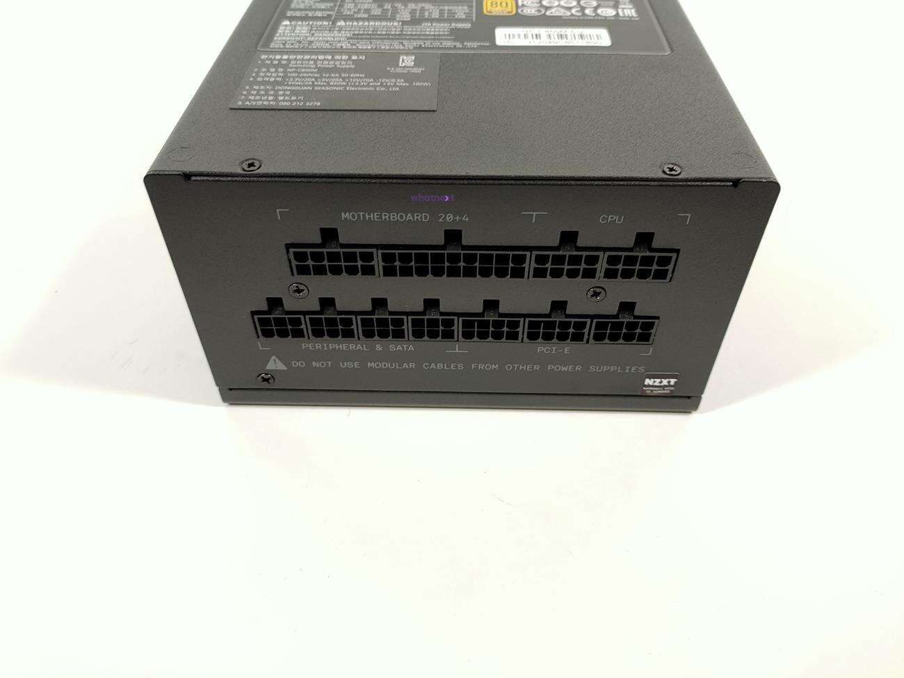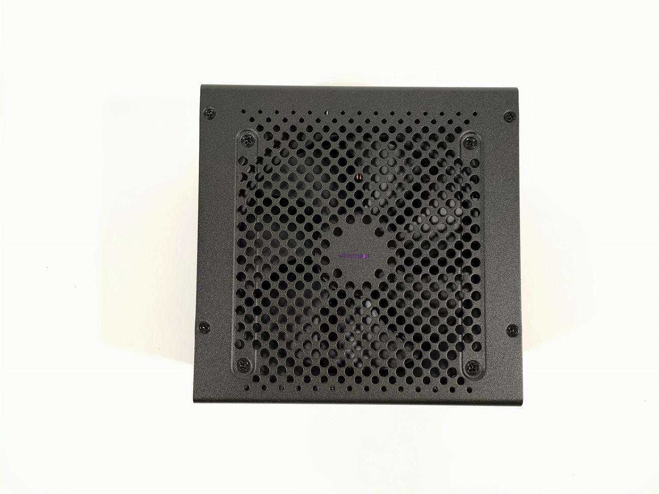 Z tyłu znajdują się otwory w kształcie plastra miodu. Jest tam też przycisk od półpasywnego trybu pracy, co od razu przynosi na myśl SeaSonic. Po jego włączeniu zasilacz działa pasywnie przy niskich obciążeniach. Na bokach znajduje się nazwa firmy wraz z nazwą modelu. Nad wentylatorem jest grill, który jest częścią obudowy. Na spodzie NZXT umieścił tabliczkę znamionową. Do dyspozycji mamy jedną linię +12V o mocy 840 W (70 A). Są też dostępne linie +3,3 V i +5 V o łącznej mocy 100 W (po 20 A na linię).