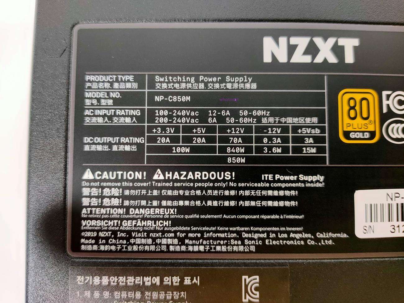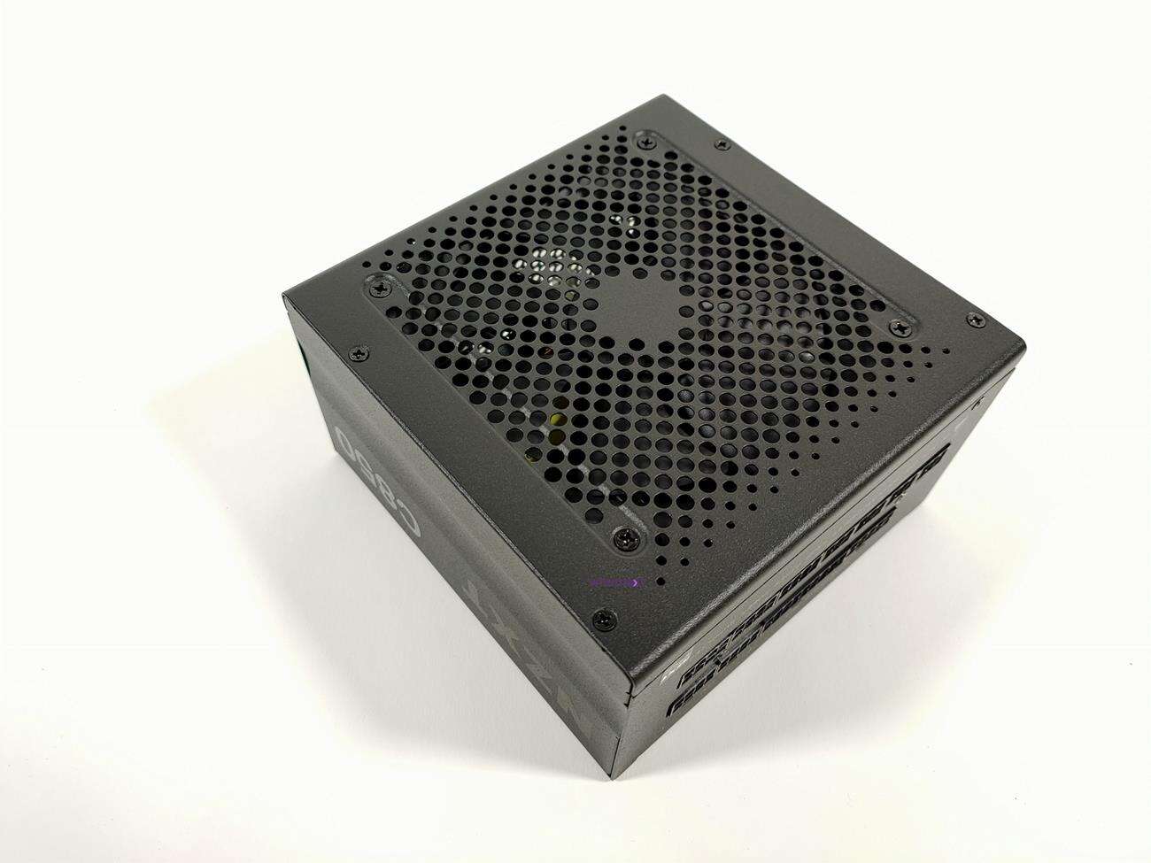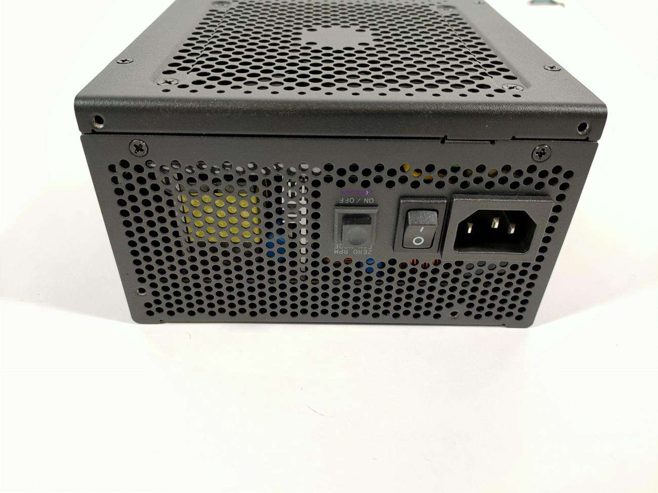Z tyłu znajdują się otwory w kształcie plastra miodu. Jest tam też przycisk od półpasywnego trybu pracy, co od razu przynosi na myśl SeaSonic. Po jego włączeniu zasilacz działa pasywnie przy niskich obciążeniach. Na bokach znajduje się nazwa firmy wraz z nazwą modelu. Nad wentylatorem jest grill, który jest częścią obudowy. Na spodzie NZXT umieścił tabliczkę znamionową. Do dyspozycji mamy jedną linię +12V o mocy 840 W (70 A). Są też dostępne linie +3,3 V i +5 V o łącznej mocy 100 W (po 20 A na linię).