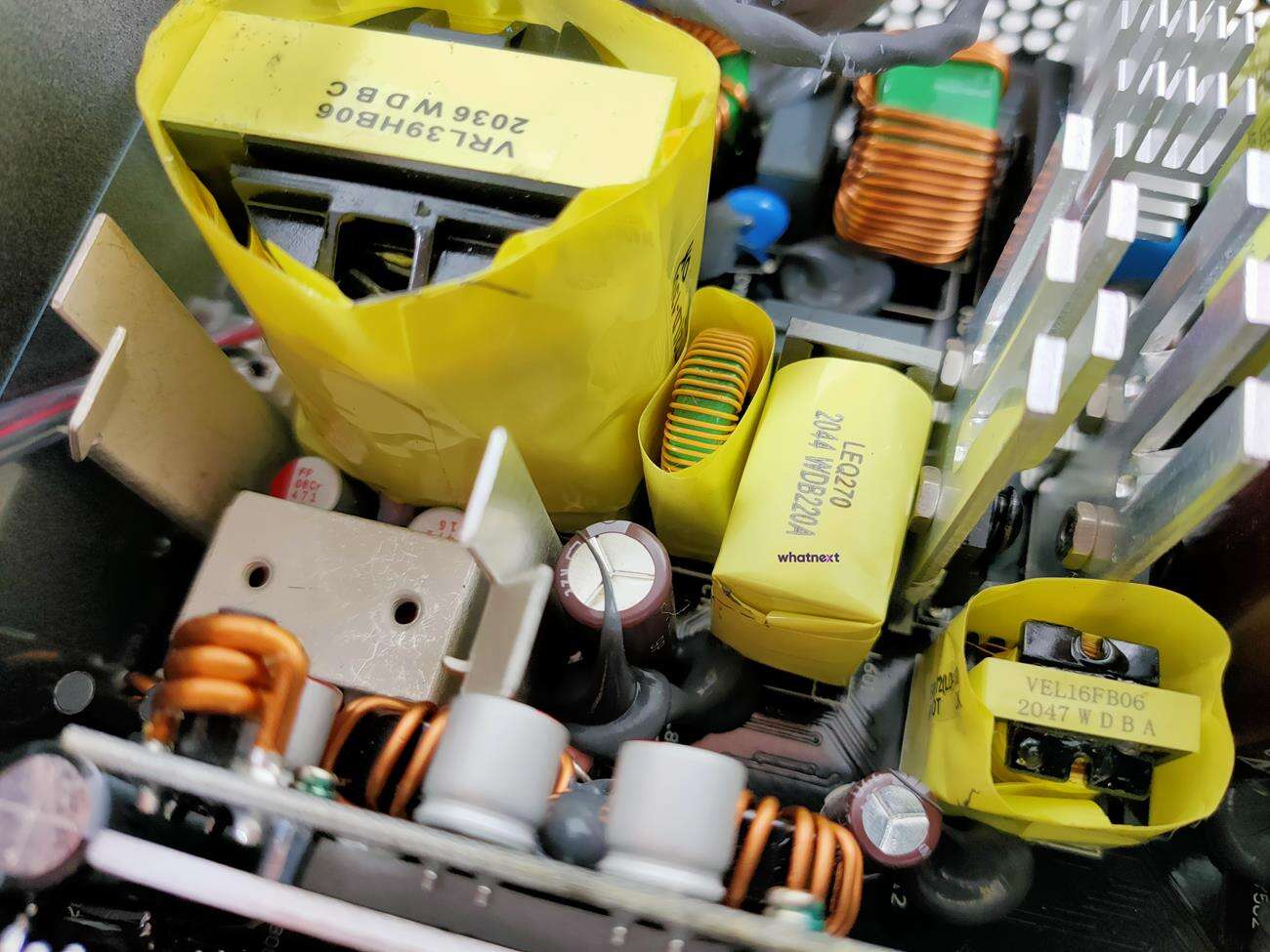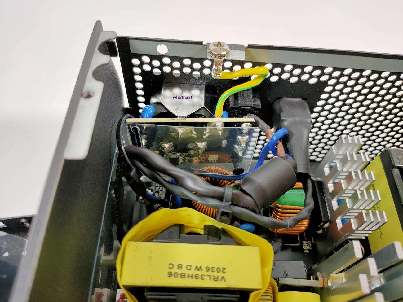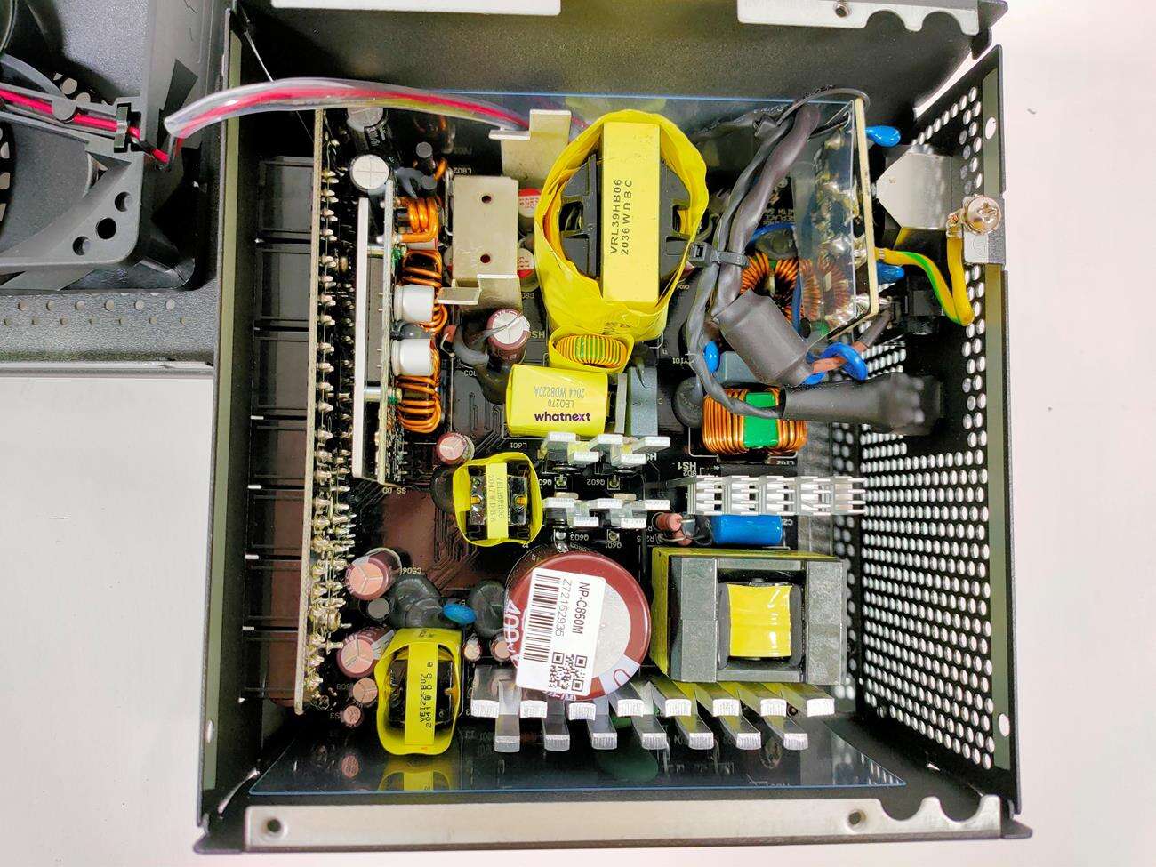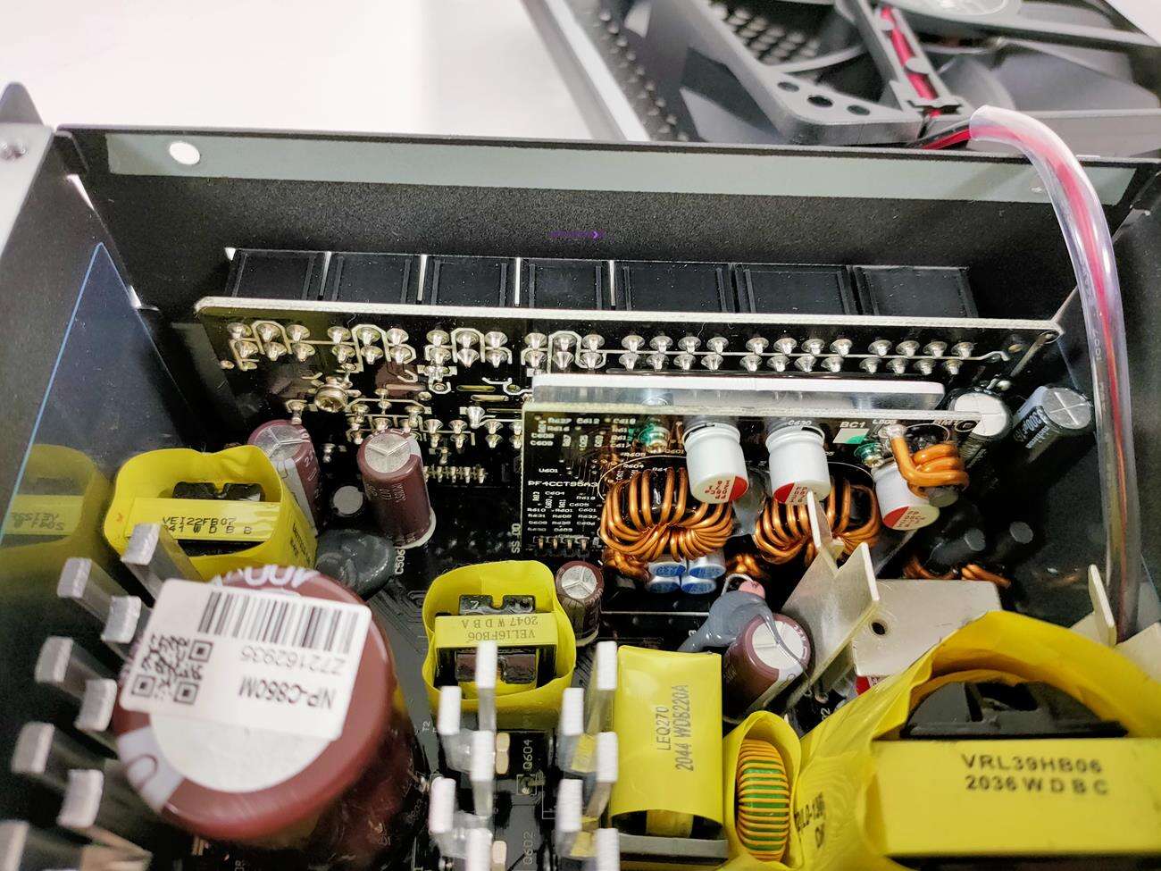 Za chłodzenie odpowiada 120 mm wentylator HA1225H12F-Z. Jego maksymalna prędkość to 2200 RPM, przepływ powietrza 73,9 CFM, a głośność 32,3 dBA. Zgodnie z oczekiwaniami, wnętrze zasilacza zostało zaprojektowanie przez SeaSonic i bazuje ono na modelu Focus Plus Gold.