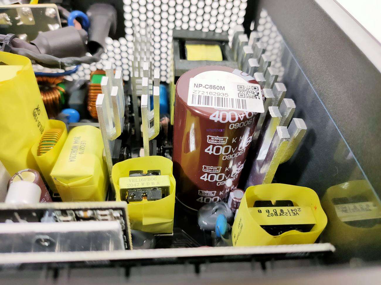 Nie zabrakło więc najwyższej jakości podzespołów, przetwornicy DC-DC czy aktywnego PFC. Największy kondensator jest produkcji Nippon Chemi-Con. Jego parametry to 400 V, 680 uF. NZXT C850 ma też sporo zabezpieczeń, choć sam producent o tym nic nie mówi. Na pewno jednak jest zabezpieczenie nadnapięciowe (OVP), zabezpieczenie podnapięciowe (UVP), zabezpieczenie nadmocowe (OPP), zabezpieczenie nadprądowe (OCP), zabezpieczenie przed nadmierną temperaturą (OTP), zabezpieczenie przed zwarciem (SCP).