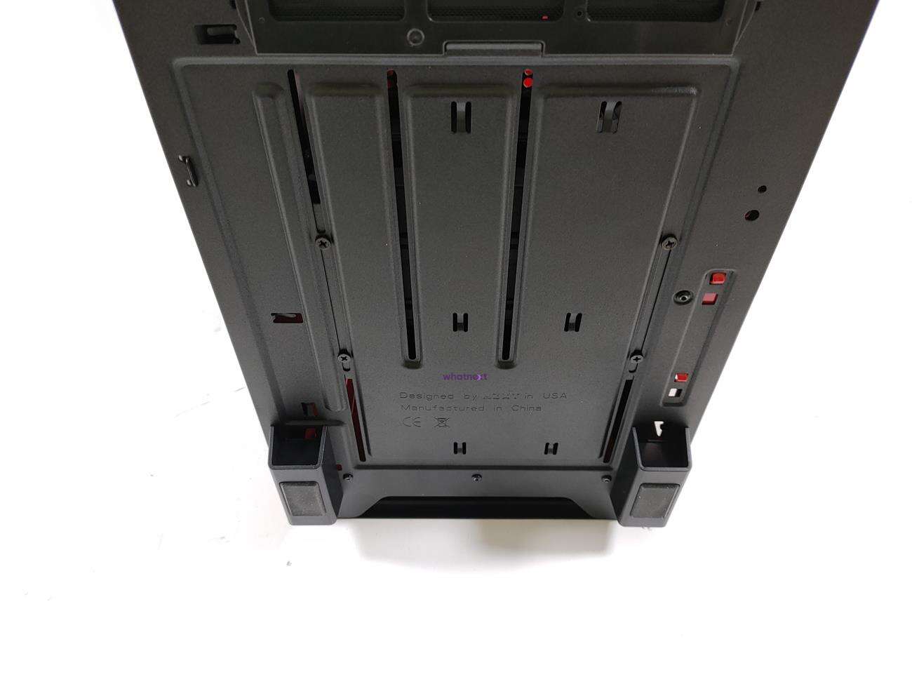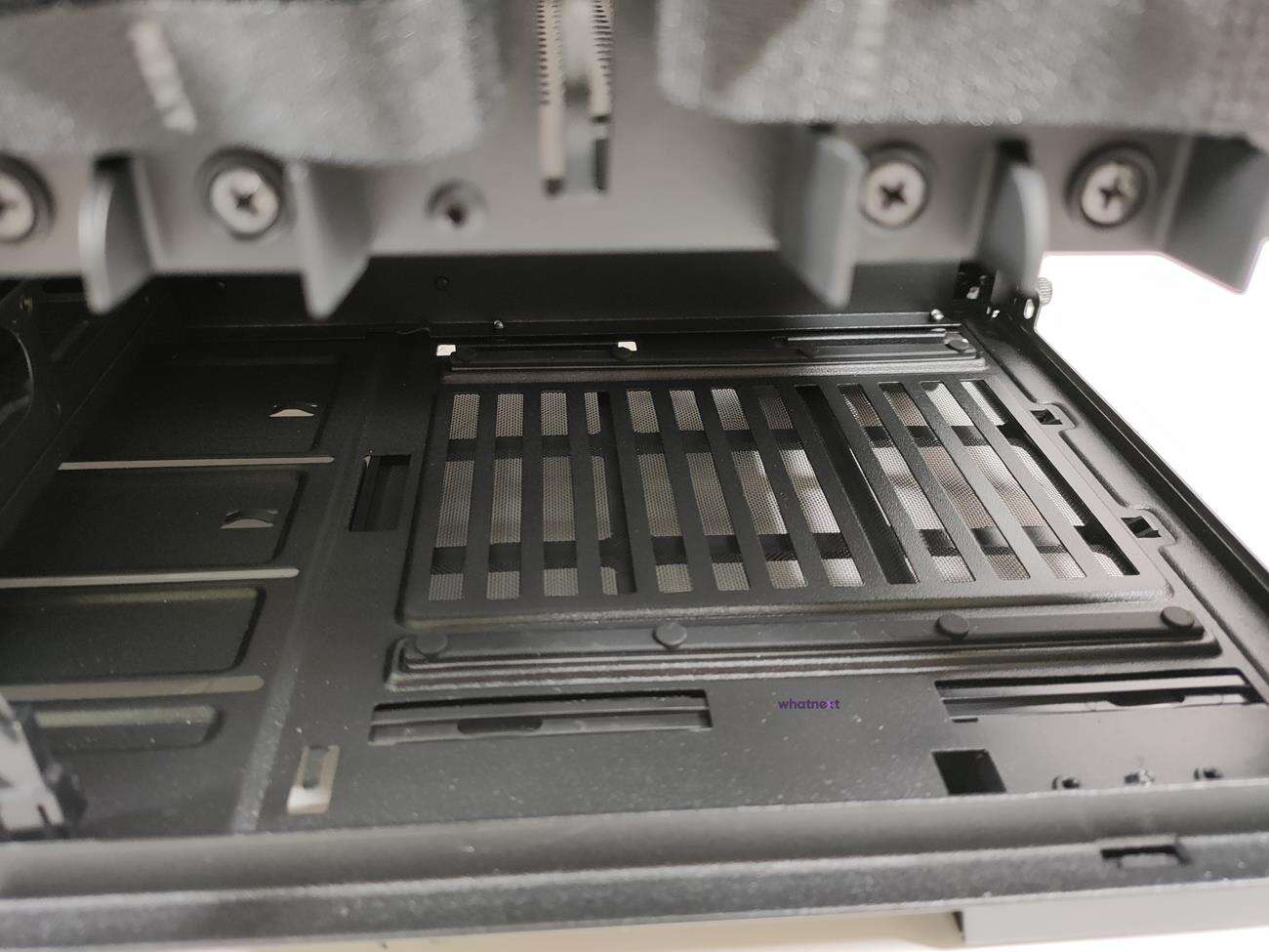 NZXT H700i stoi na czterech nóżkach i nie ślizga się po panelach. Pod zasilaczem widać filtr przeciwkurozwy z wygodną rączką. Dalej są otwory pozwalające na demontaż lub zmianę położenia koszyka na dyski.