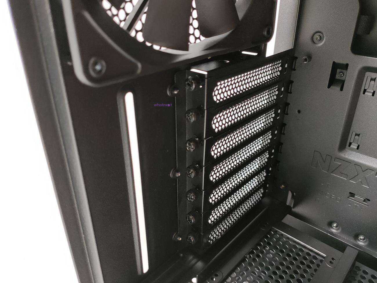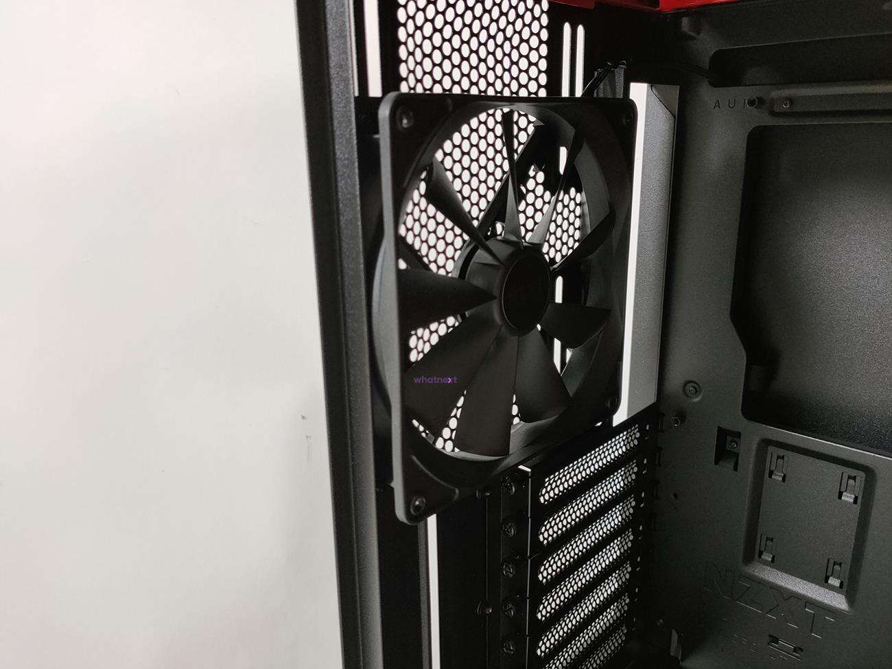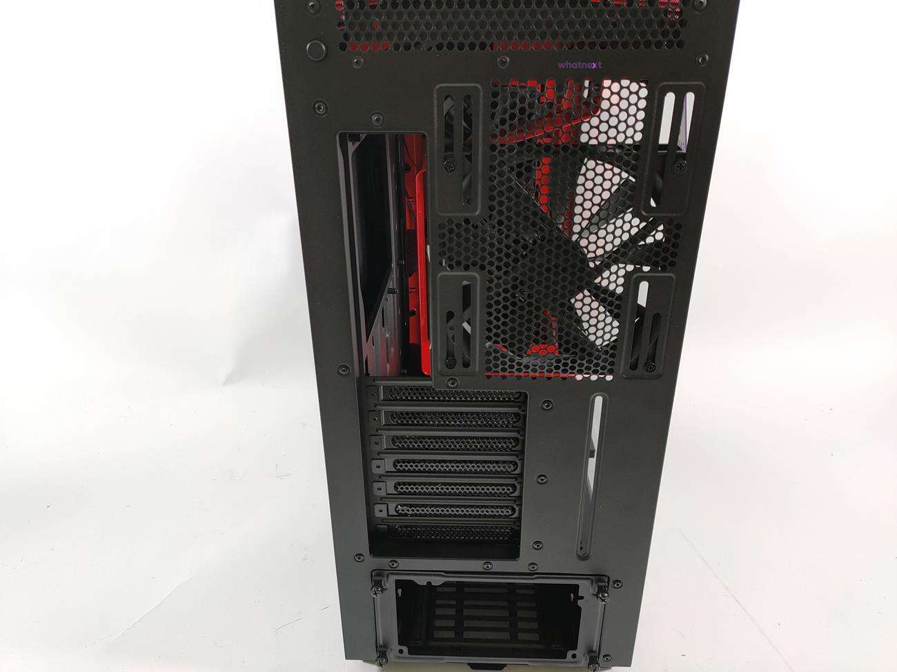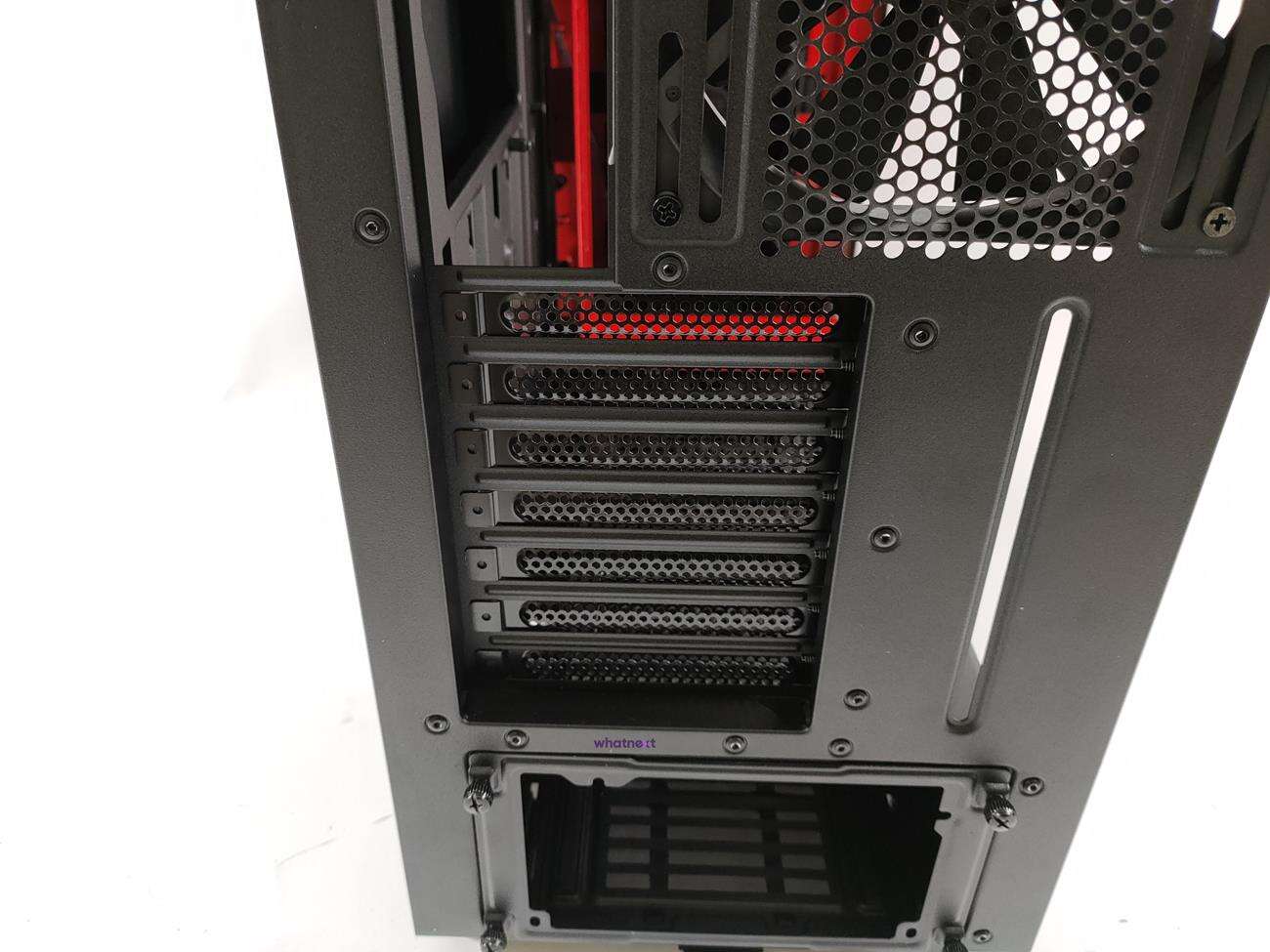 Tył jest standardowy. Zasilacz wsadzany jest od tyłu, stąd specjalny montaż. Wyżej jest siedem zaślepek PCI mocowanych na szybkośrubki. Na samej górze jest wentylator, ale tym razem jest to model Aer F140. Jego maksymalna prędkość to 1500 RPM, przepływ powietrza 103,43 CFM a głośność 35 dBA.