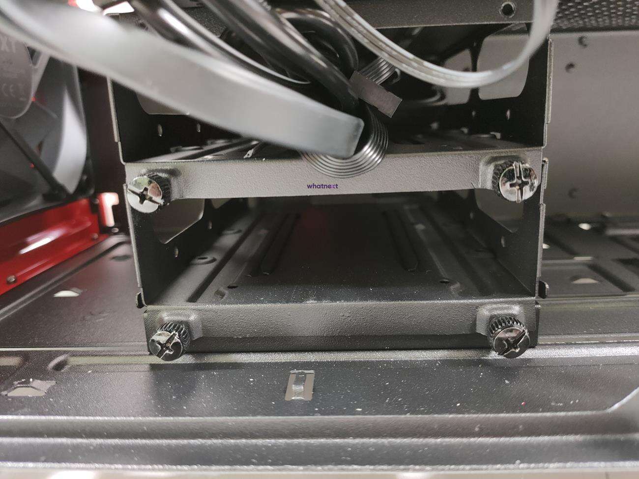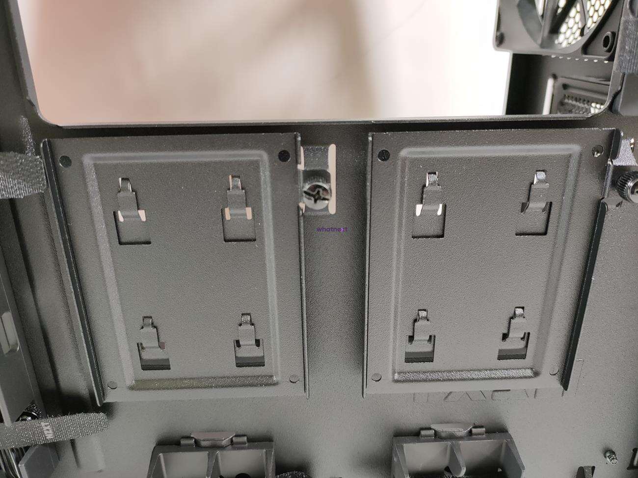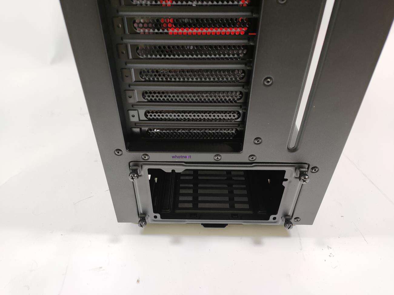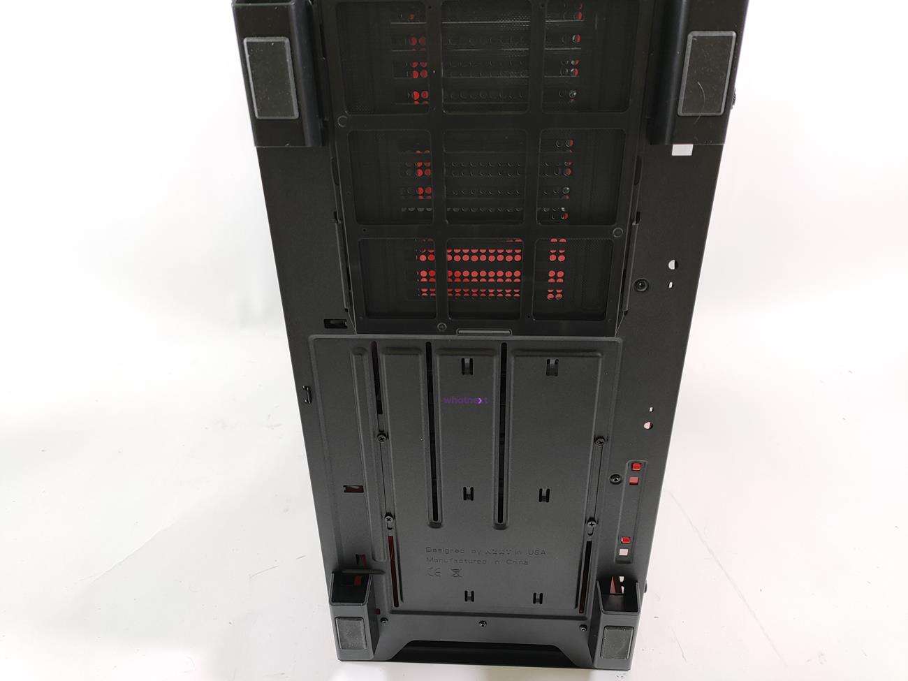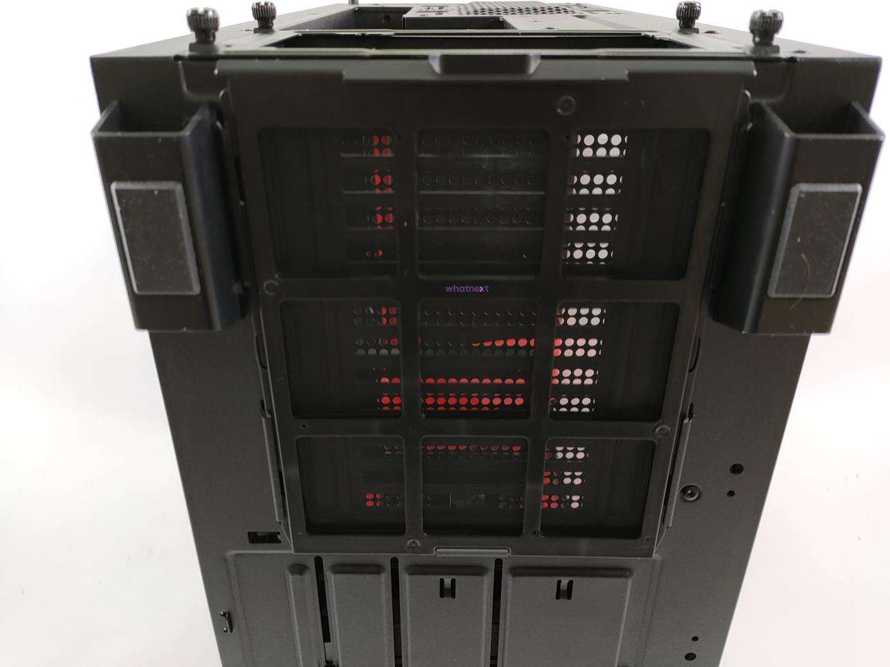 Wnętrze zostało podzielone na dwie strefy. Na metalowej obudowie znajdują się miejsca do montażu dysków 2,5 cala, jest wycięcie na przednią chłodnicę oraz otwory na kable od zasilacza.