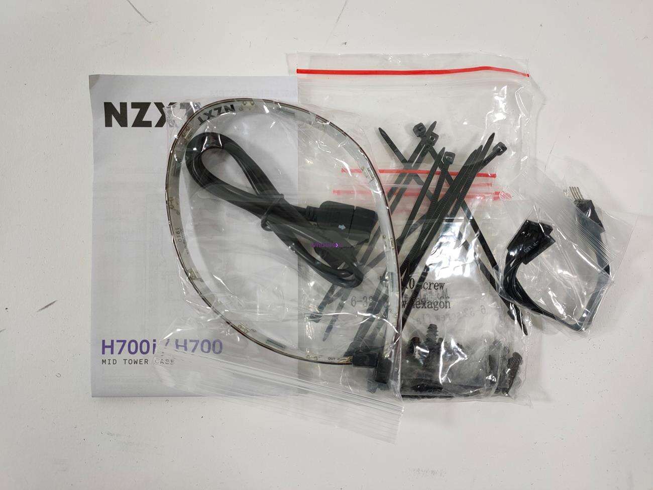 Obudowa zapakowana została w karton przedstawiający białą wersję. Jest to standardowe opakowanie dla wszystkich H700i, więc nie zdziwcie się. Wraz z obudową otrzymujemy instrukcję, pasek LED, opaski zaciskowe oraz zestaw śrubek.