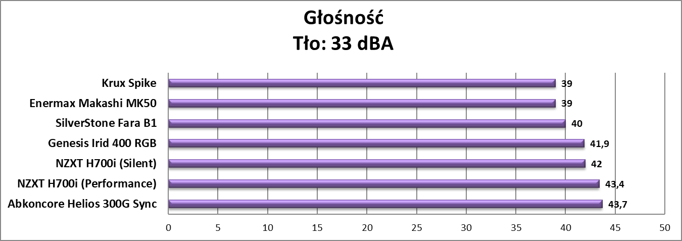 - Głośność zmierzyłem przy zamkniętej obudowie z odległości 20 cm od środka lewego boku – tło wynosiło 33 dBA.