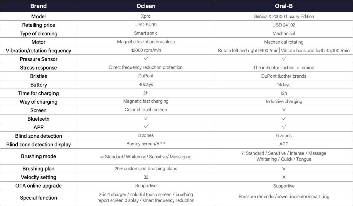 Z technicznego punktu widzenia oba mają szereg dojrzałych technologii, ale to Oclean Xpro ma bardziej innowacyjne technologie. Oral-b ma jednak wyższą reputację i wpływy, ale już z punktu widzenia szczegółów produktu (takich jak żywotność baterii, ochrona przed ciśnieniem itp.) Oclean jest bardziej przyjazny dla użytkownika, a na jego szalę wybór przechyla też stosunek ceny do wydajności.