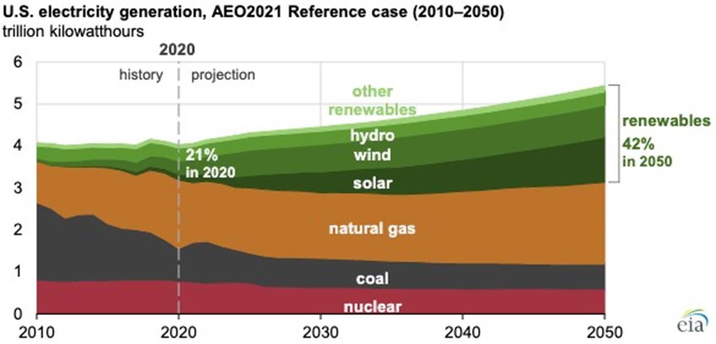 Wiele wskazuje na to, że do 2030 roku odnawialne źródła energii łącznie przewyższą energię czerpaną z gazu ziemnego i tym samym staną się jednych z głównych źródeł wytwarzania energii elektrycznej w USA. Do 2050 roku z kolei wartości te względem 2020 roku ulegną podwojeniu, sięgając aż 41%.