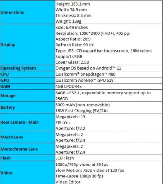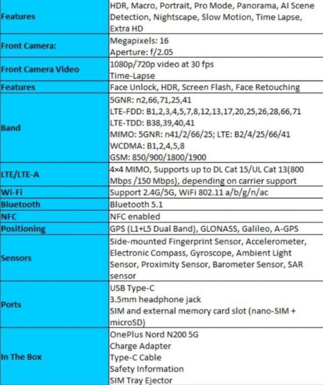 Co wiemy o specyfikacji… Cóż, chyba już wszystko, co tylko możemy, bo na swoim Twitterze Evan Blass, znany z wiarygodnych przecieków, opublikował całą tabelę ze specyfikacją OnePlus Nord N200 5G.
