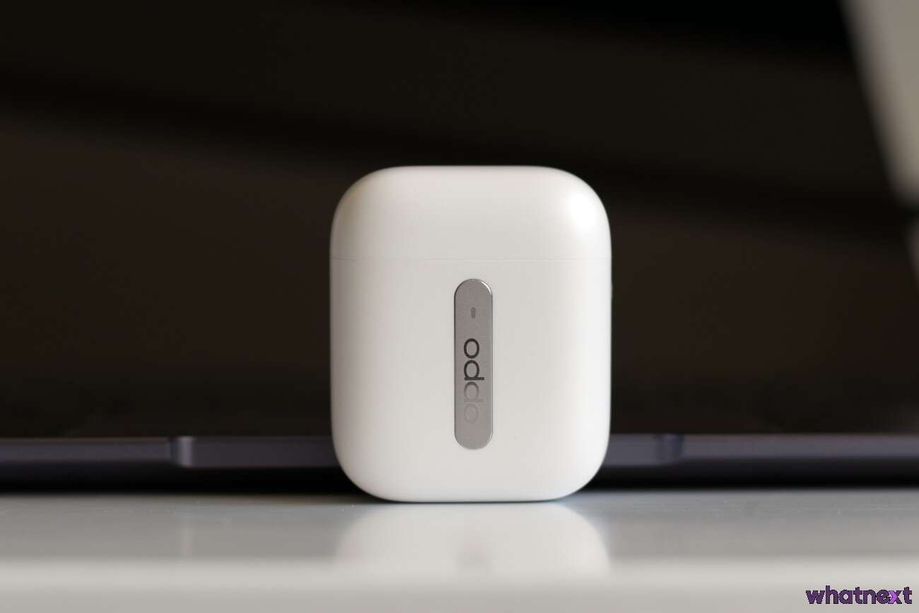 Oppo Enco Free są zapakowane w pokrowiec wielkości pudełka od zapałek. Jego masa to 48,2 grama. Jest wykonany z grubego plastiku i pokryty matową farbą. Mamy na nim logo i diodę sygnalizującą stan słuchawek w przedniej części, przycisk do parowania na prawym boku oraz port USB-C na dolnej krawędzi.
