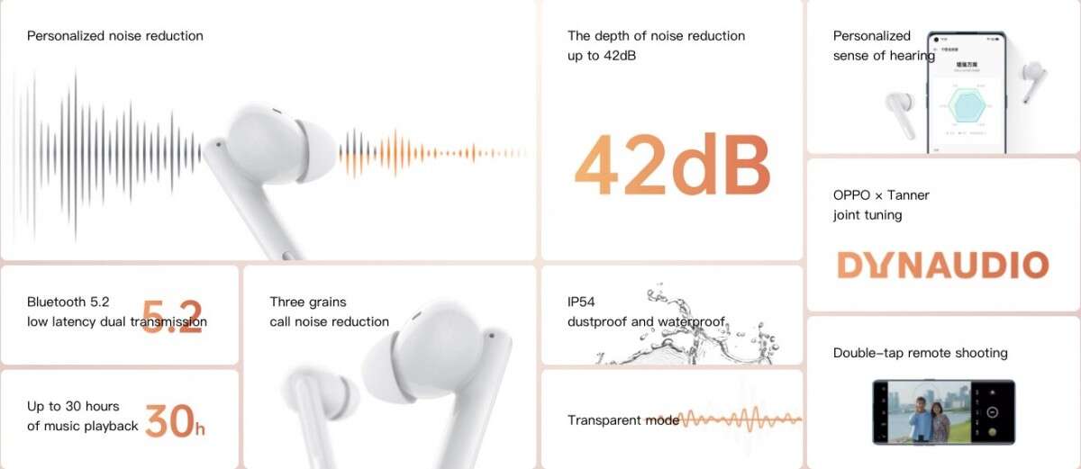 Wraz z nowo wprowadzoną serią Reno 6, Oppo ogłosiło nową parę słuchawek TWS o nazwie Enco Free2. Oferują one konstrukcję douszną z silikonowymi końcówkami wraz z aktywną redukcją szumów i 30-godzinną żywotnością baterii. Tutaj należy jednak pamiętać, że chodzi o łączny czas działania z wykorzystaniem etui ładującego. Podczas korzystania, na jednym naładowaniu Enco Free2 zaoferują nam 6,5 godziny słuchania bez włączonego ANC. Jeśli zaś włączymy aktywną redukcję hałasu czas pracy zmniejszy się do 4,5 godziny.