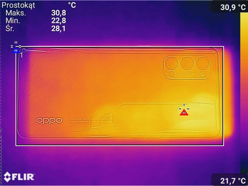 W testach temperatury (podczas testu 3DMark) wykorzystałem moduł termowizyjny smartfonu CAT S61. Smartfon zachowuje niską temperaturę podczas benchmarka, więc nie macie się co martwić o to, że podczas intensywnego użytkowania telefon zrobi się mocno gorący.
