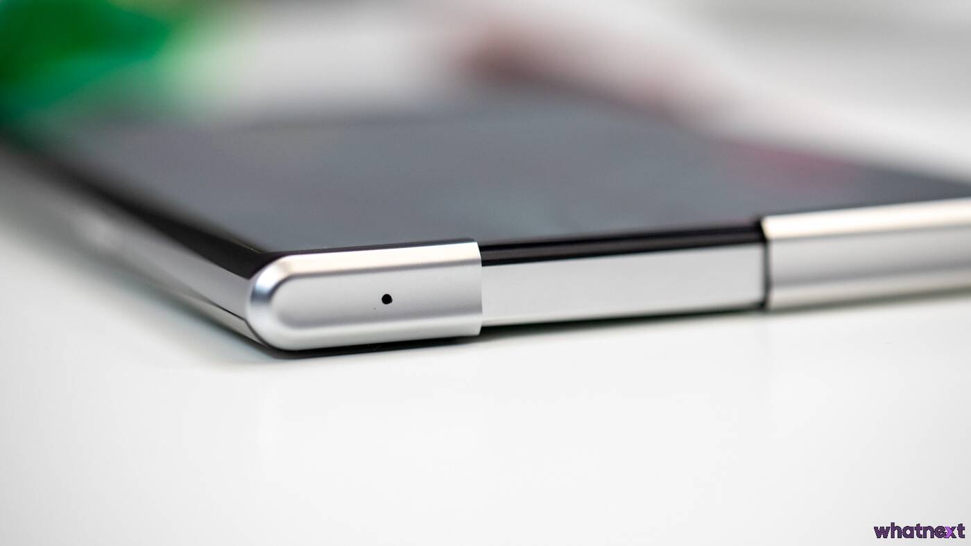 Wystarczy popatrzeć na ekran pod odpowiednim kątem, żeby zobaczyć, że idealnie płasko to tutaj nie jest. Specjalnie pokazuję Wam brzydkie zdjęcie, aby było to dobrze widoczne. Mimo wszystko faktycznie na tle klasycznych składanych konstrukcji, miejsce zagięcia ekranu jest bardzo słabo widoczne.