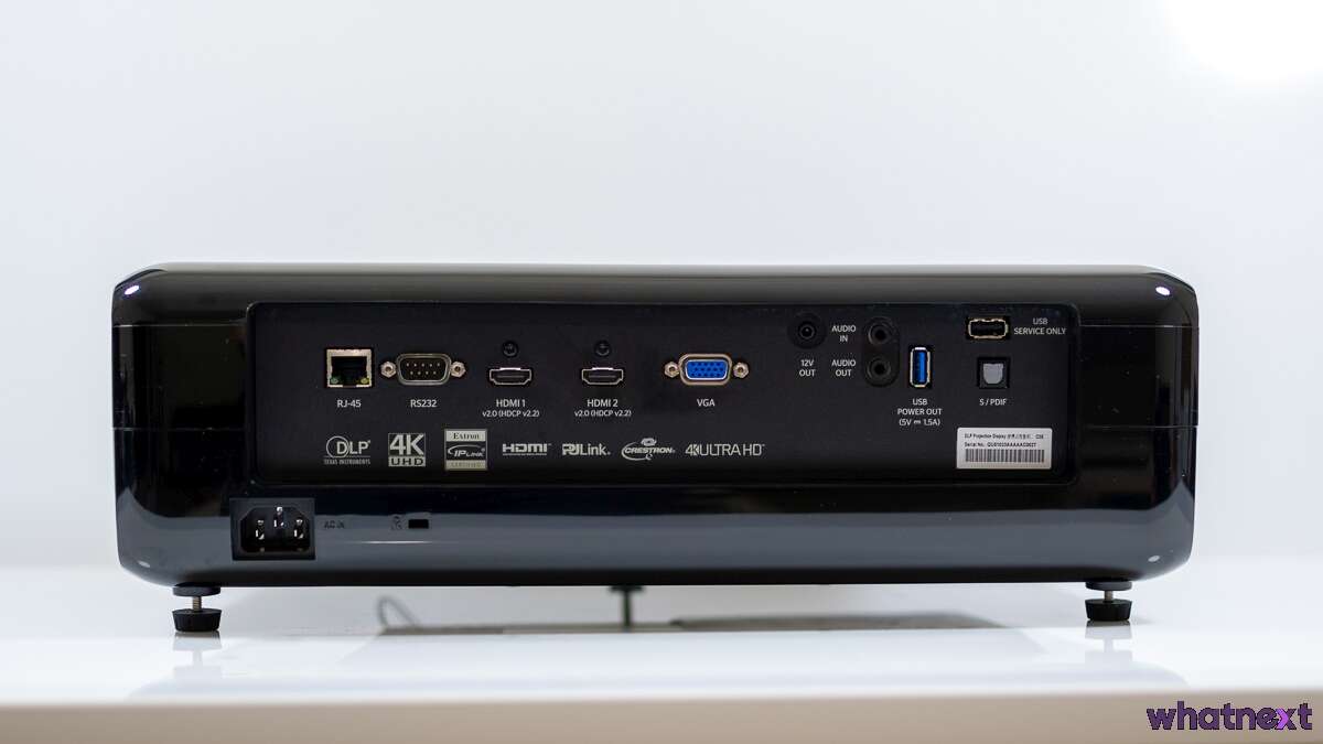 Projektor wygląda… jak projektor. Ma dość klasyczne wymiary i masę. Z przodu znajdziemy lampę i głośniki, z góry przyciski, a z tyłu ogrom portów.