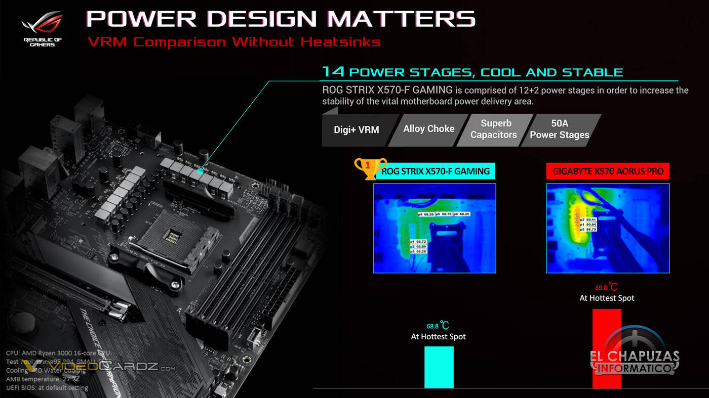 Mowa dokładnie o porównania względem płyt głównych MSI oraz Gigabyte, a więc mamy do czynienia z trójką największych graczy na rynku płyt głównych. A przynajmniej z jednymi z największych. Videocardz (via El Chapuzac Informatico) twierdzi, że wszystkie poniższe slajdy z prezentacji pochodzą od ASUSa, więc zaliczają się do materiałów promocyjnych.