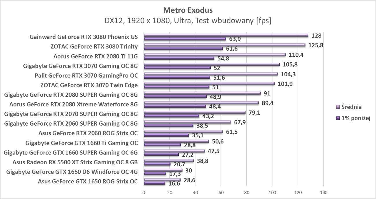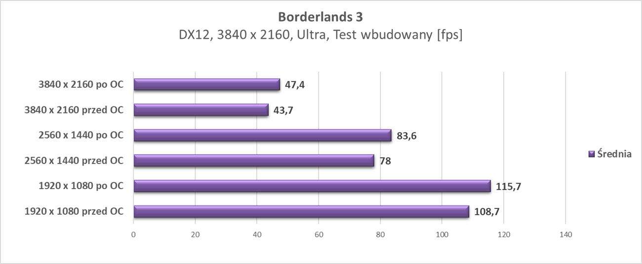 Ostatnia z rozdzielczości to również w pełni płynna rozgrywka, choć w połowie gier grafika średnio nie osiąga 60 fps. Jednakże wyniki bliskie mocno podkręconemu RTX 2080 Ti są warte uwagi.