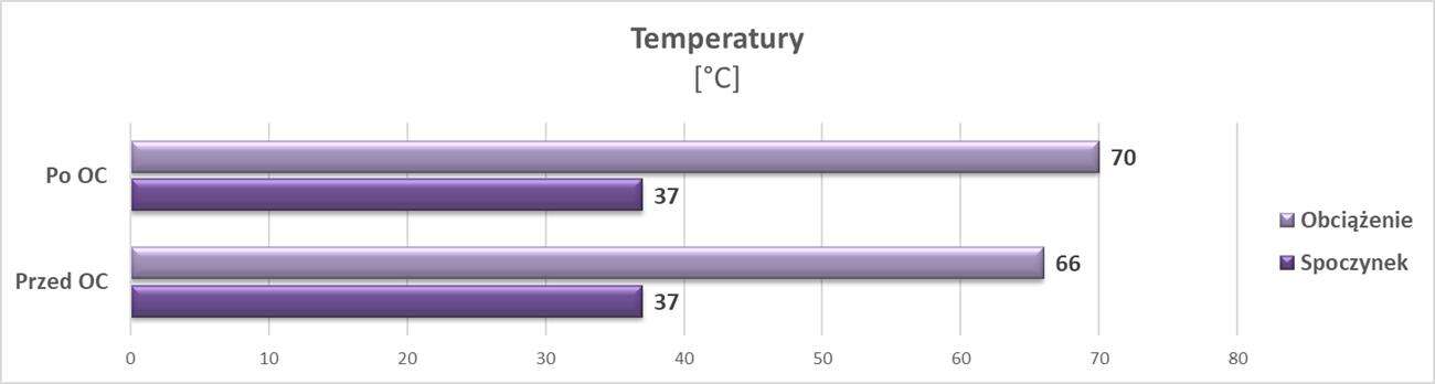 W tych testach grafika sprawuje się bardzo dobrze. Jest ona chłodna i cicha pod obciążeniem. W spoczynku wentylatory nie kręcą się, więc jest idealna cisza. Mocne i duże chłodzenie rzeczywiście znakomicie sprawdza się w praktyce. Grafika jest słabiej podkręcona od wersji Gigabyte, stąd niższy pobór mocy.