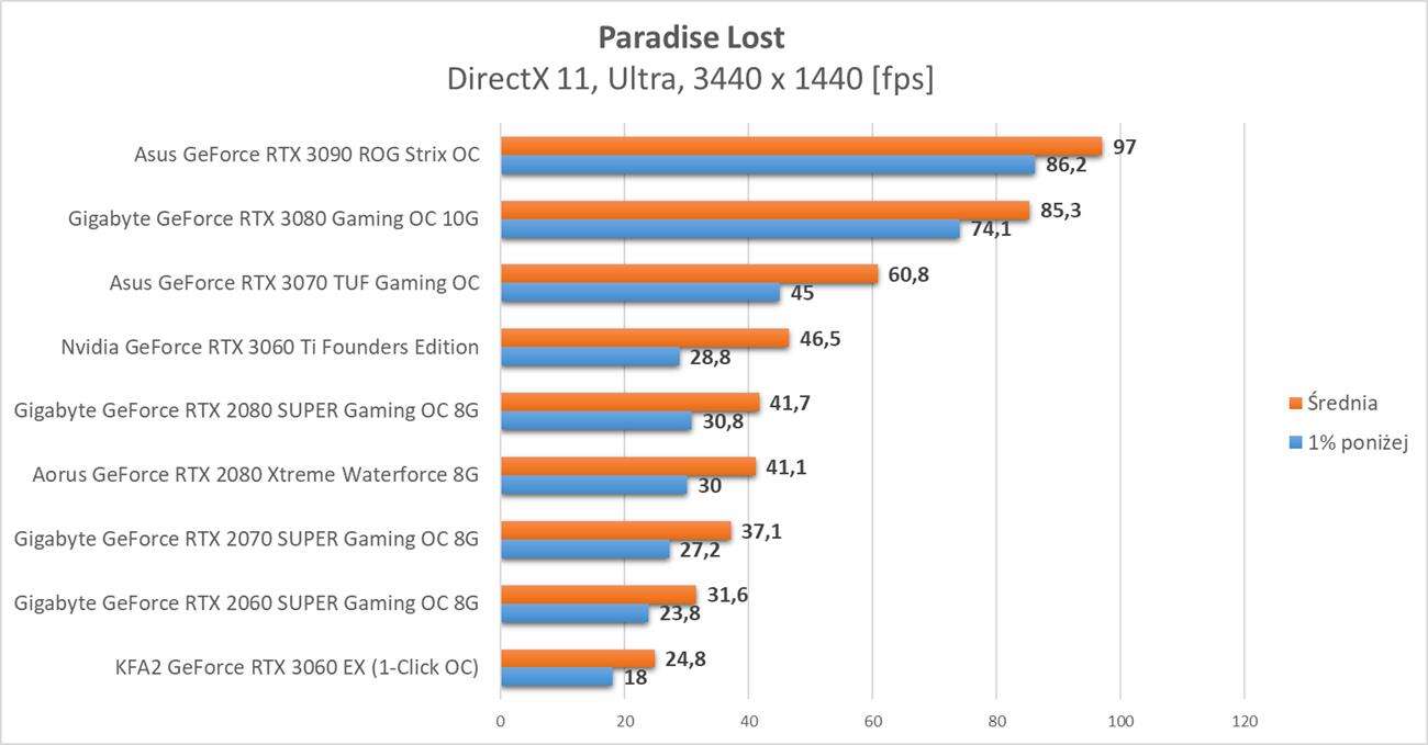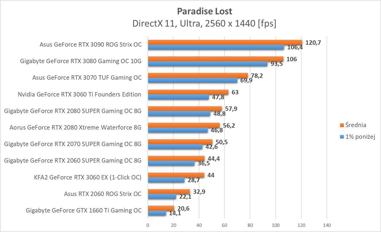 Paradise Lost to mało dynamiczny tytuł, więc tak naprawdę za płynne można uznać 30 fps. Na najwyższych ustawieniach jest to jednak wymagająca gra. Tę minimalną wartość w Full HD osiąga GTX 1660 SUPER. Warto jednak zauważyć, że średnio 60 fps osiaga dopiero RTX 2060 SUPER.