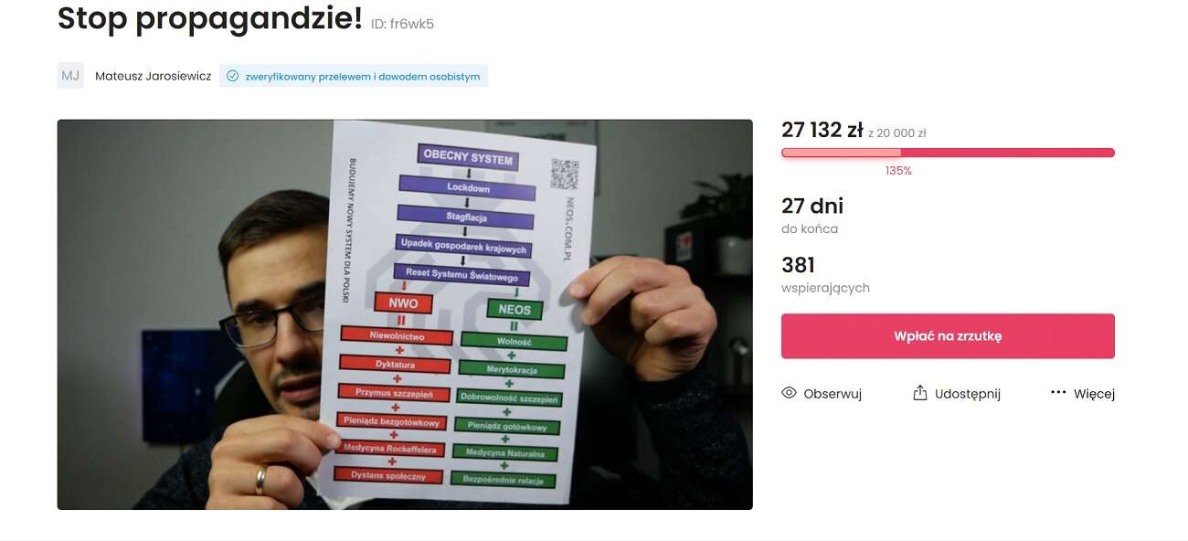 Bohater TEGO materiału aktualnie zbiera pieniądze na walkę z dezinformacją w serwisie Zrzutka.pl. Czyli ulotki przestrzegające przed szczepionkami, rządem światowym, testami na obecność COVID_19 oraz promujące własną wizję świata. Jeśli zastanawialiście się kiedyś, czy to dochodowe zajęcie, to już wiecie że tak. Wystarczy głośno wykrzykiwać teorie spiskowe i na zbiórce jest już ponad 27 tys. złotych.