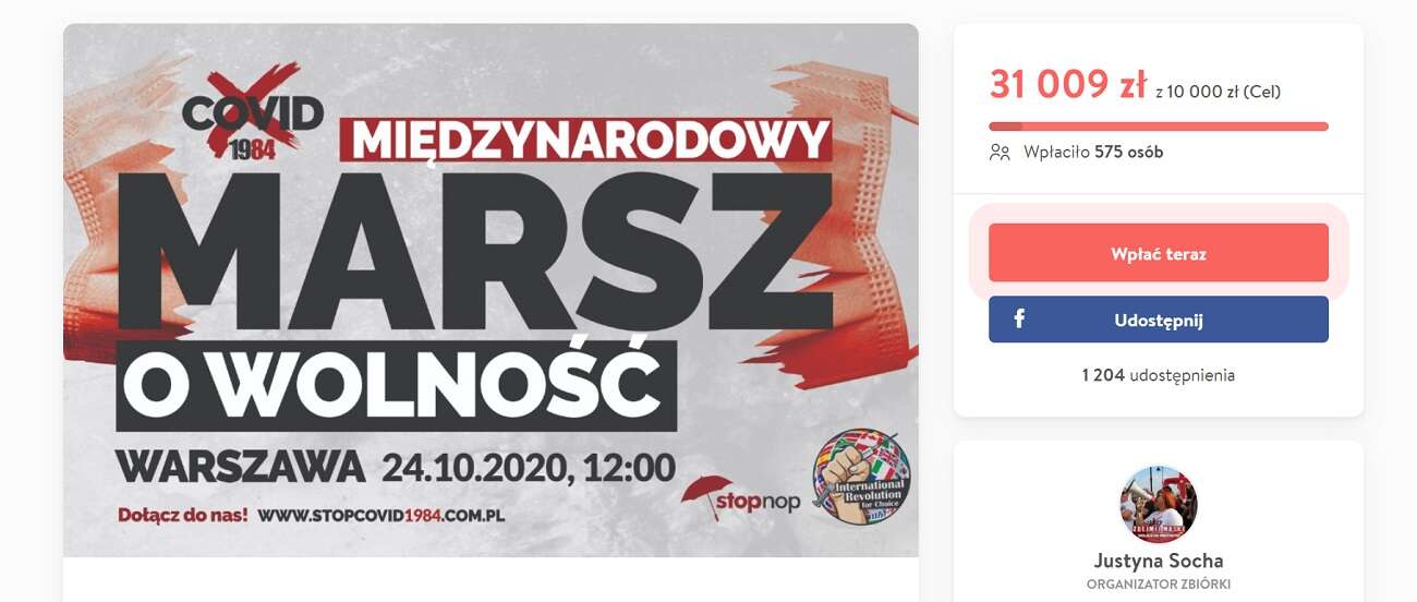 Tymczasem na Pomagam.pl pieniądze zbierają organizatorzy sobotniej nielegalnej manifestacji antycovidowców. Tutaj również licznik kręci się bardzo mocno.