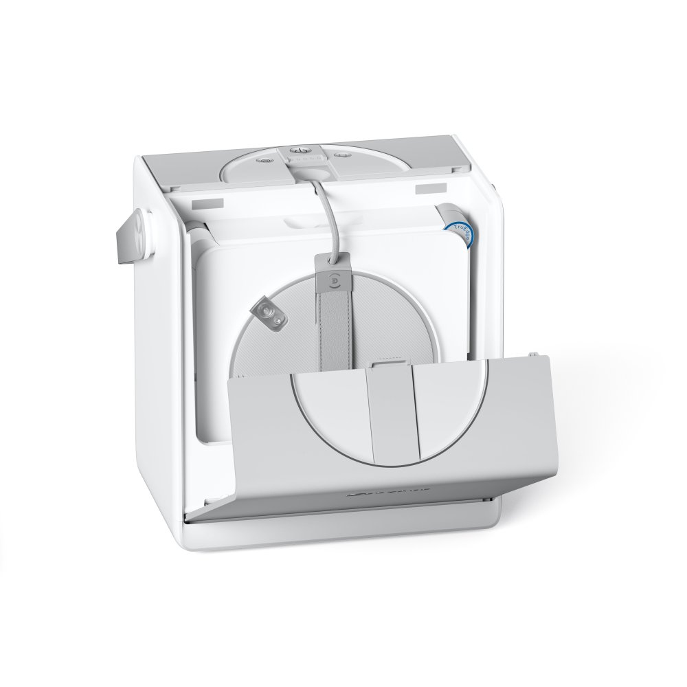 Warto zauważyć, że kabel zasilający i linka zabezpieczająca, spięte w jednym przewodzie, ułatwiają obsługę oraz zapobiegają plątaniu. Gdy robot wraca do punktu startowego, kabel automatycznie zwija się. Co więcej, miękka gumowa rączka stacji All-in-One OMNI ułatwia jej podnoszenie i przenoszenie.