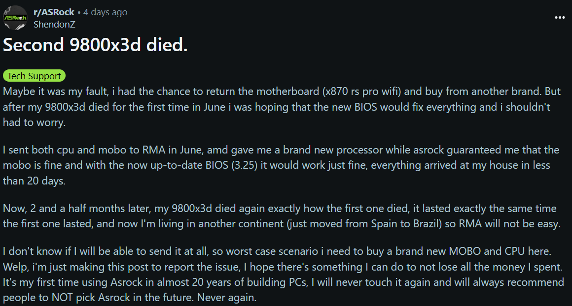 Użytkownik Reddita o pseudonimie ShendoZ twierdzi, że jego płyta główna ASRock X870 RS PRO WiFi zniszczyła już drugi procesor. Użytkownik żałuje, że zaufał marce ASRock, obwiniając się jednocześnie za to, że nie zwrócił płyty po pierwszym incydencie. Zamiast tego, wierzył, że wydawane przez ASRock aktualizacje BIOS-u, udostępniane przez firmę przez ostatnie miesiące, rozwiążą problem.