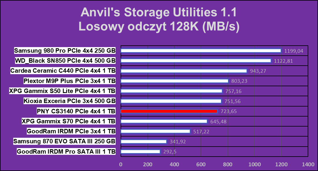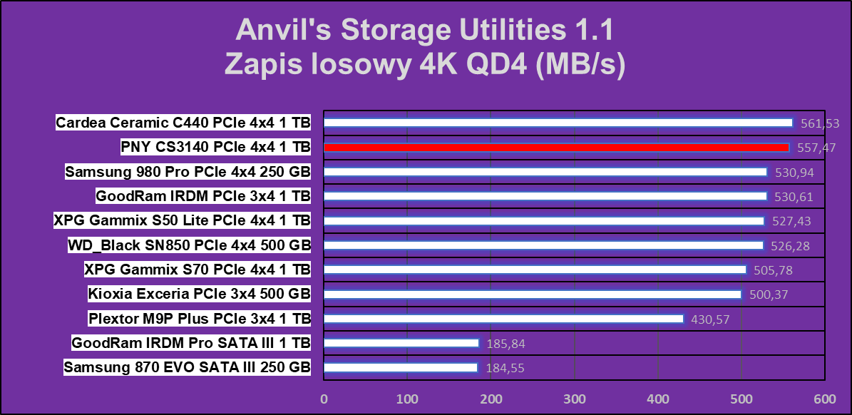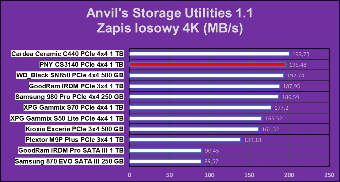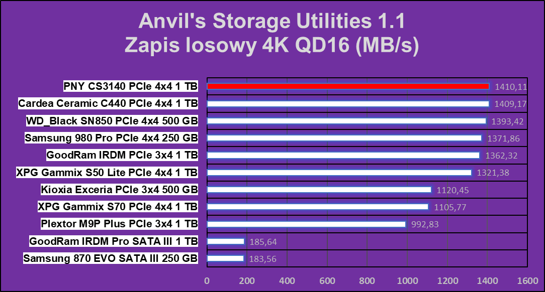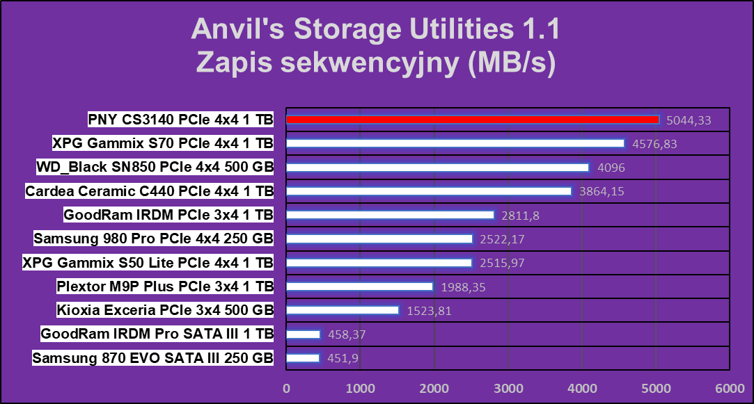 Jak pokazują wykresy, PNY XLR8 CS3140 1 TB ma chwile przebłysku najwyższej wydajności, które ustępują tylko w czterech na dziesięć testów. W zapisie wydaje się, że dysk ten nie ma sobie równych.