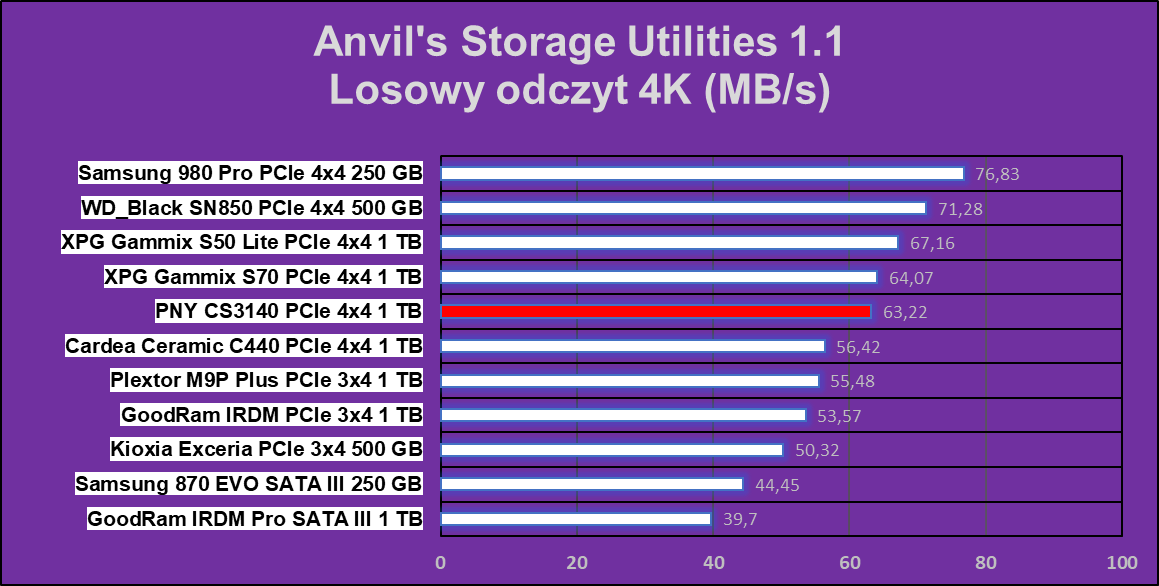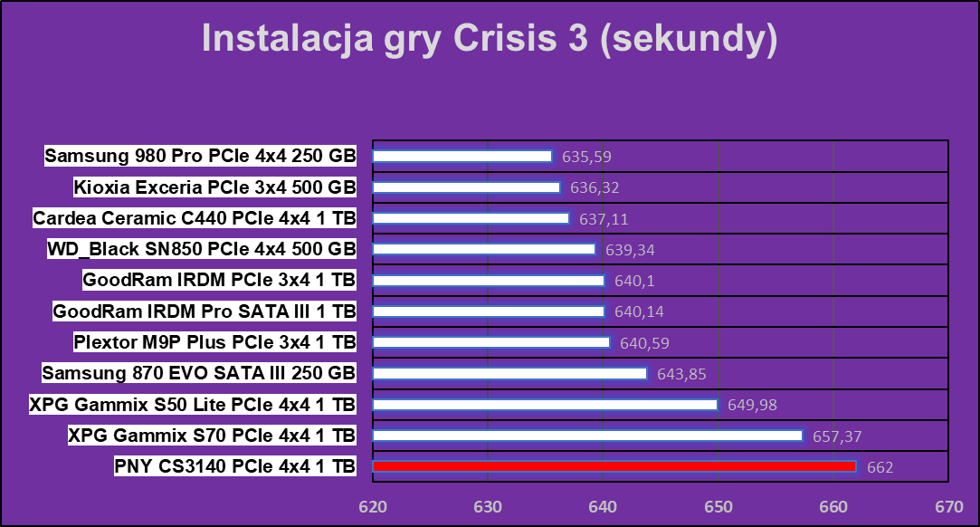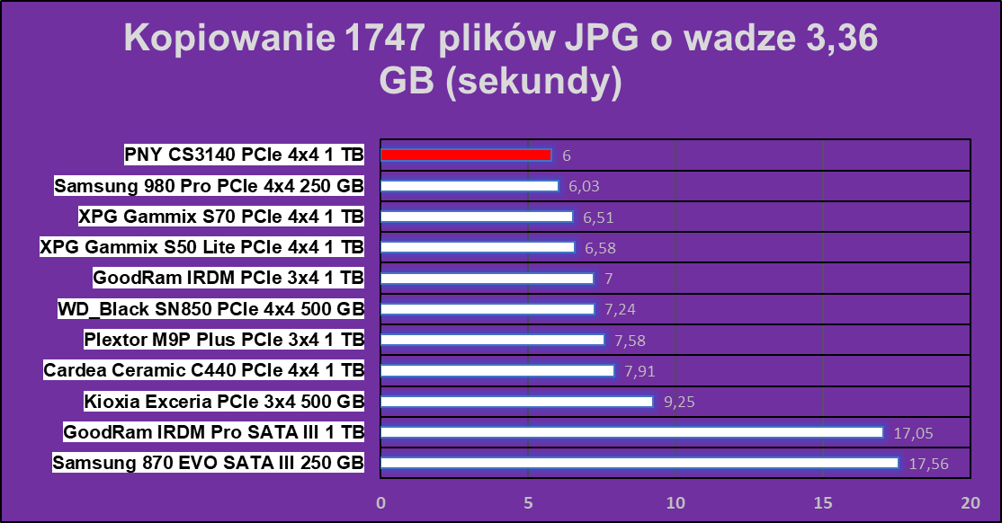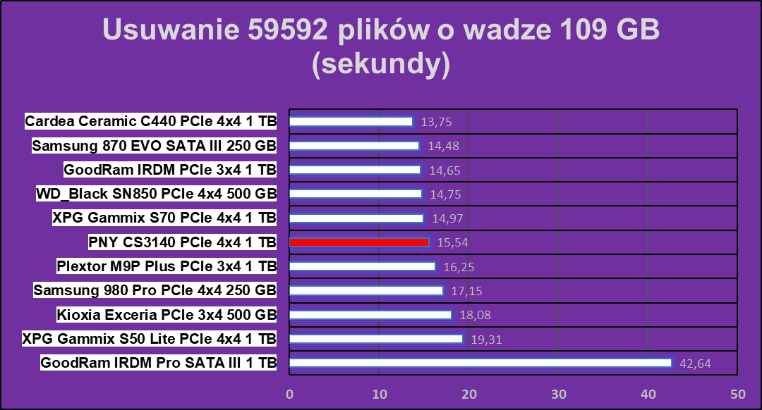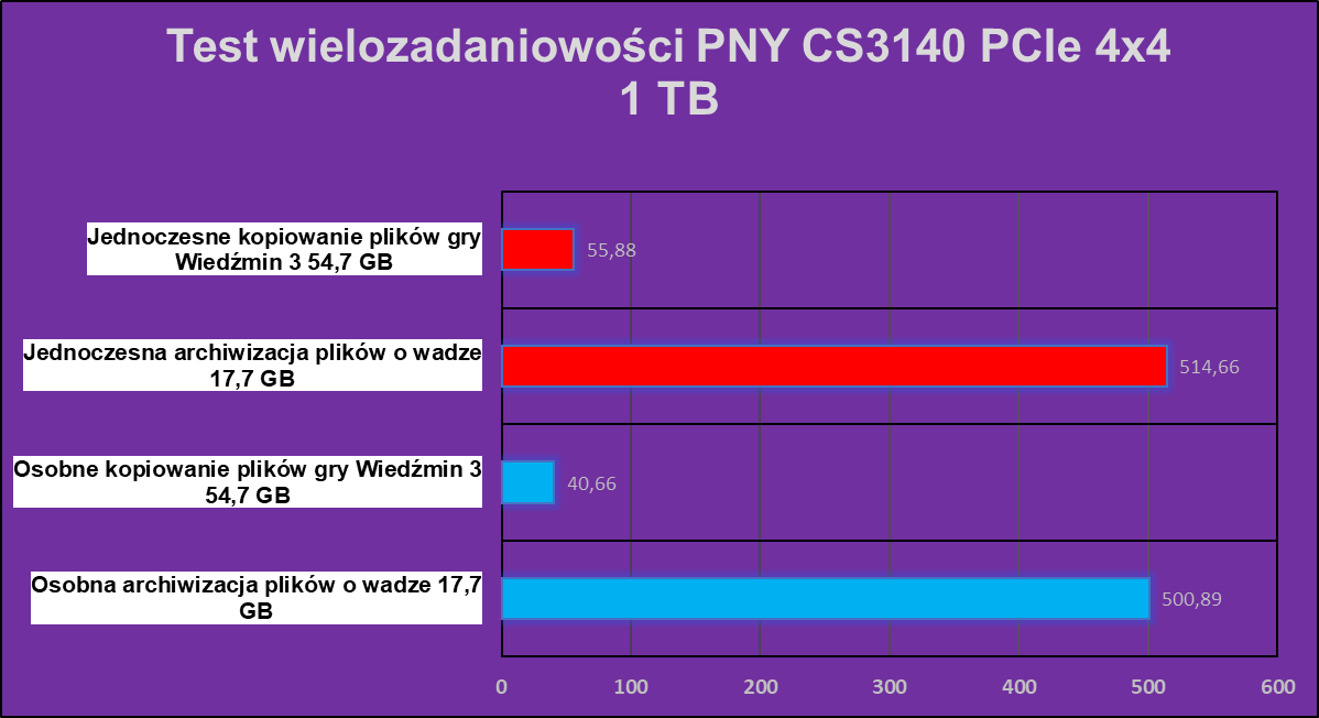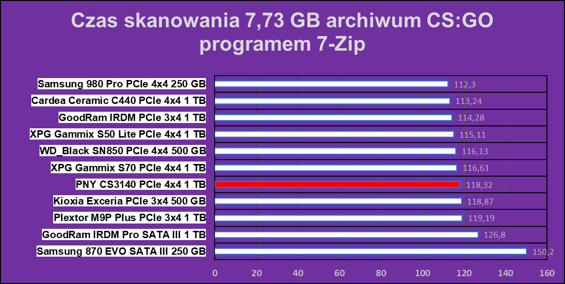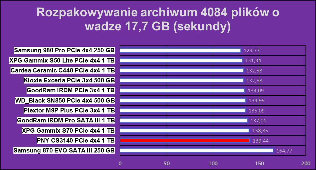 Co się stało? Chcielibyśmy wiedzieć sami, ale jak widać tutaj hegemonia PNY XLR8 CS3140 1 TB się kończy. Dysk wypadł najgorzej w praktycznie wszystkich zadaniach, co potwierdziłem trzema dodatkowymi testami i ku mojemu zaskoczeniu, każdy wynik był bliski tym prezentowanym poniżej. Co tu dużo mówić, coś tutaj zwyczajnie nie zagrało, ale znów nie ma tragedii, pomijając wydajność w archiwizacji.