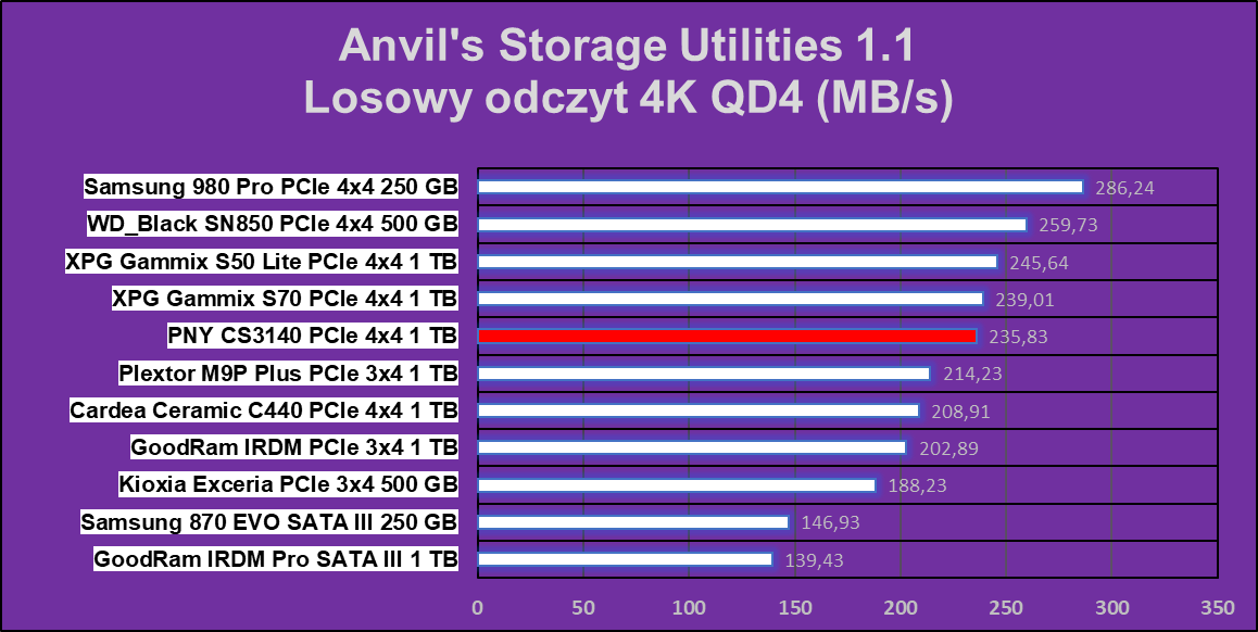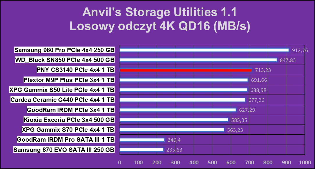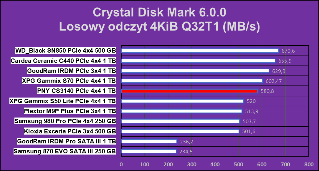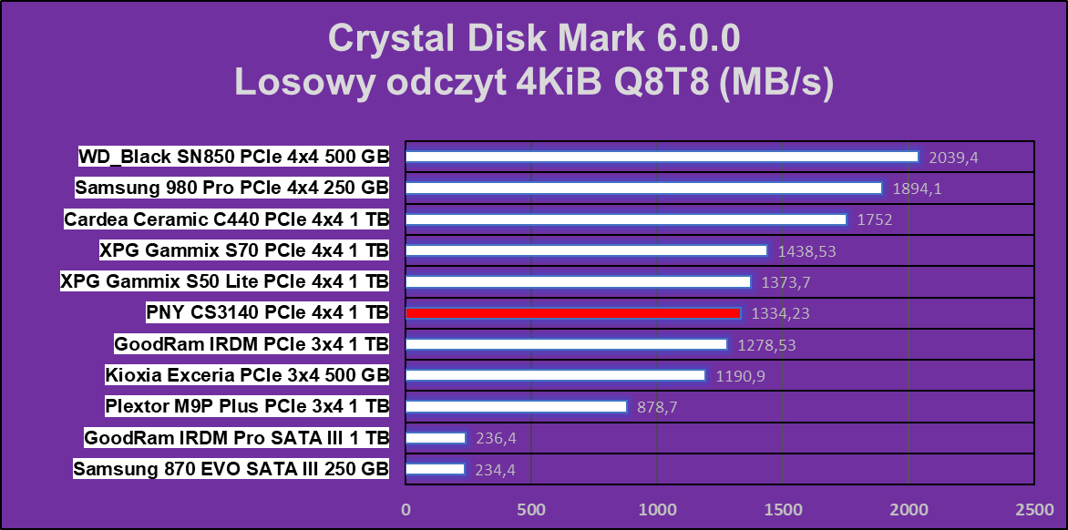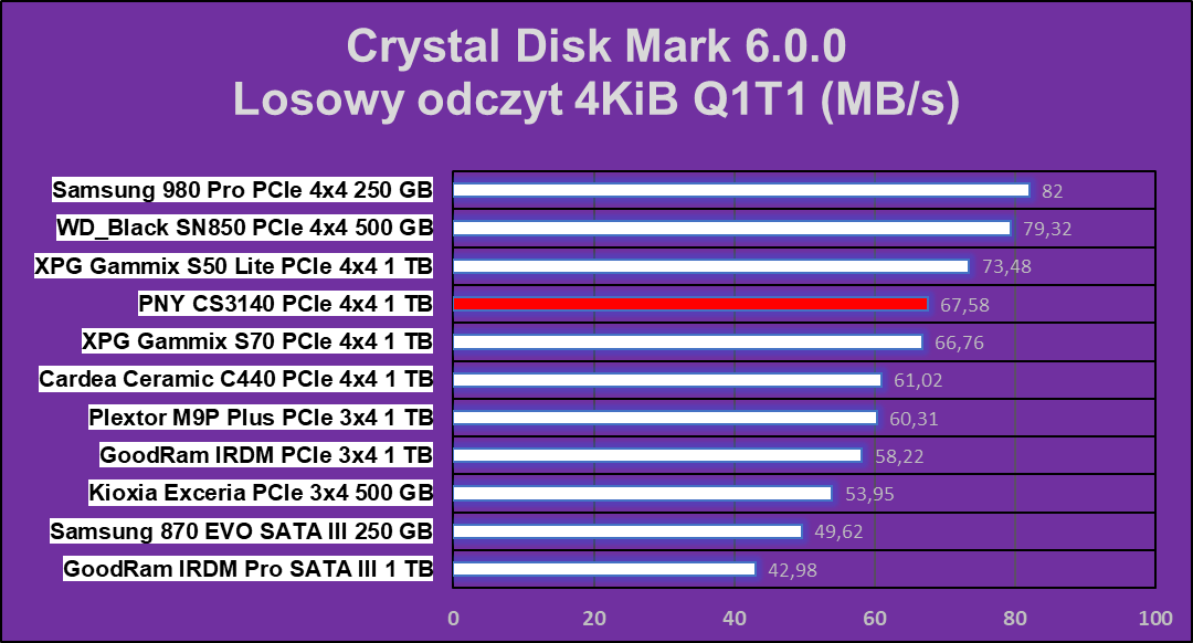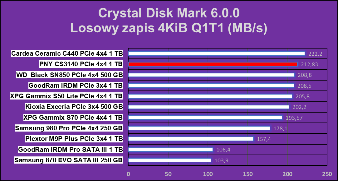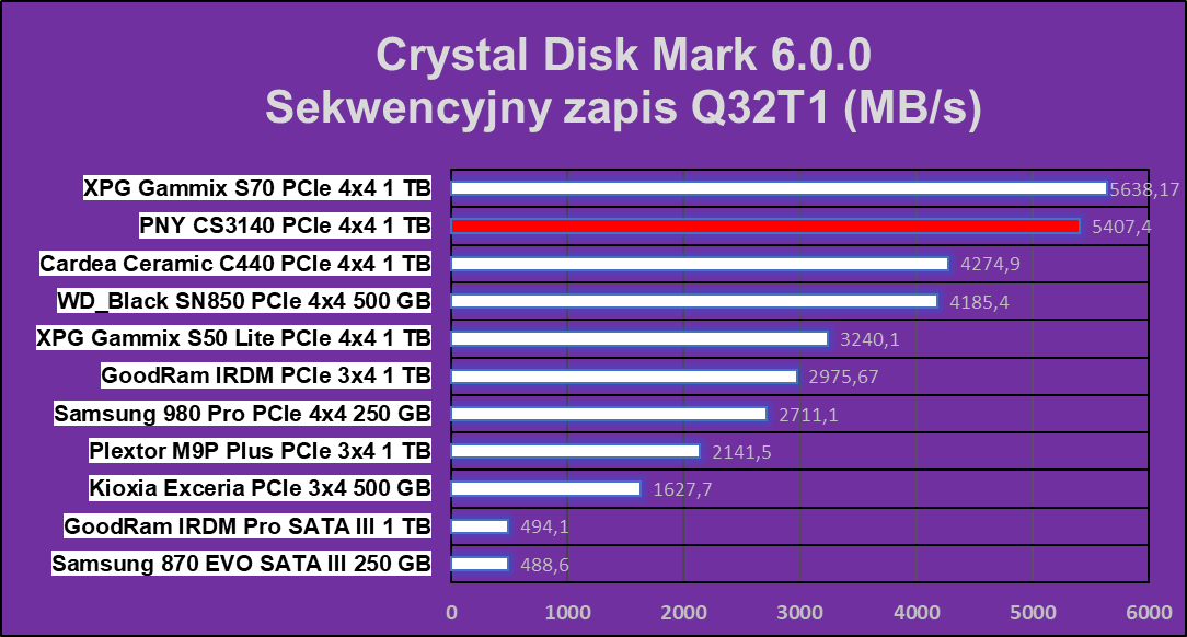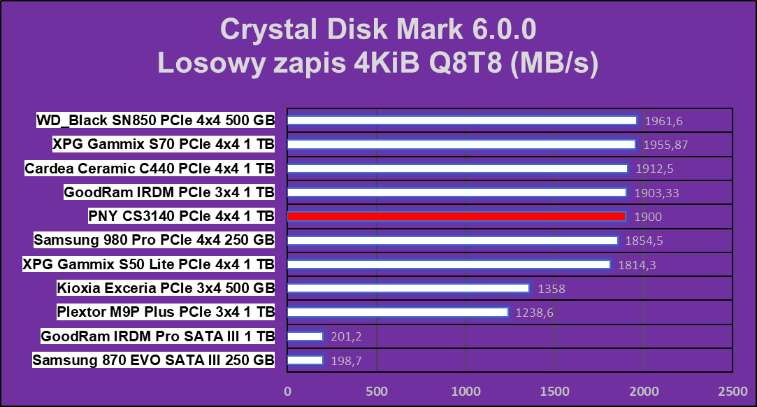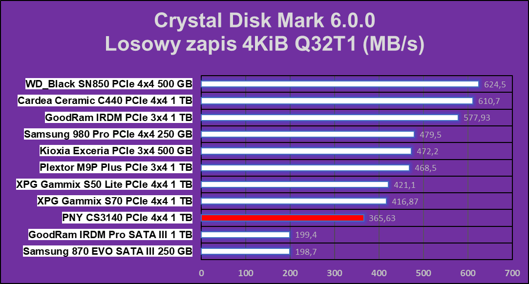 Test Crystal Disk Mark nie pokazał dysk PNY XLR8 CS3140 1 TB z nieco gorszej strony, ale nadal w niektórych operacjach ten wręcz niszczy znakomitą większość konkurencji.