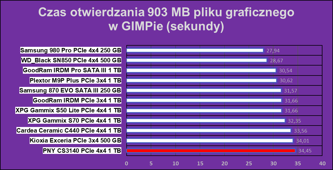 Co ciekawe, PNY XLR8 CS3140 1 TB jest jednym z najtańszych dysków na PCIe 4.0 o tak wysokiej wydajności, co z marszu zapewnia mu wyróżnienie opłacalności. Jest wręcz bezkonkurencyjny w operowaniu na plikach, ale w programach jego wydajność jest tak nieproporcjonalna względem pozostałych osiągów oraz innych modeli, że bezpośrednio polecić go mogę tylko tym, którym te kilka sekund w programach nie robi wielkiej różnicy.