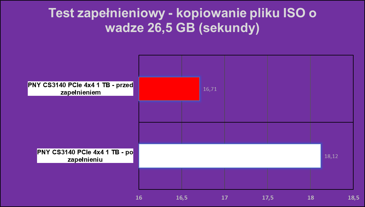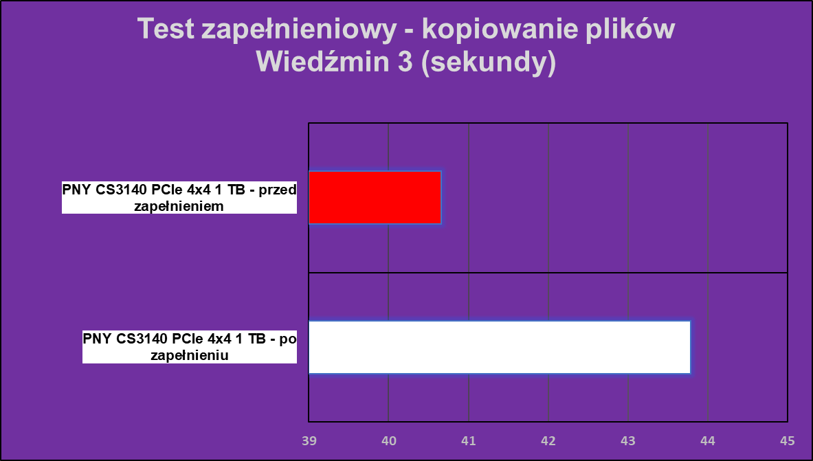 Wydajność PNY XLR8 CS3140 1 TB po zapełnieniu 90% pojemności praktycznie nie spada. W grę wchodzą ledwie kilkuprocentowe (i to z rzadka) spadki w poszczególnych próbkach, co potwierdzają dwa zadania kopiowania, które potrzebowały tylko odrobine więcej czasu do realizacji.