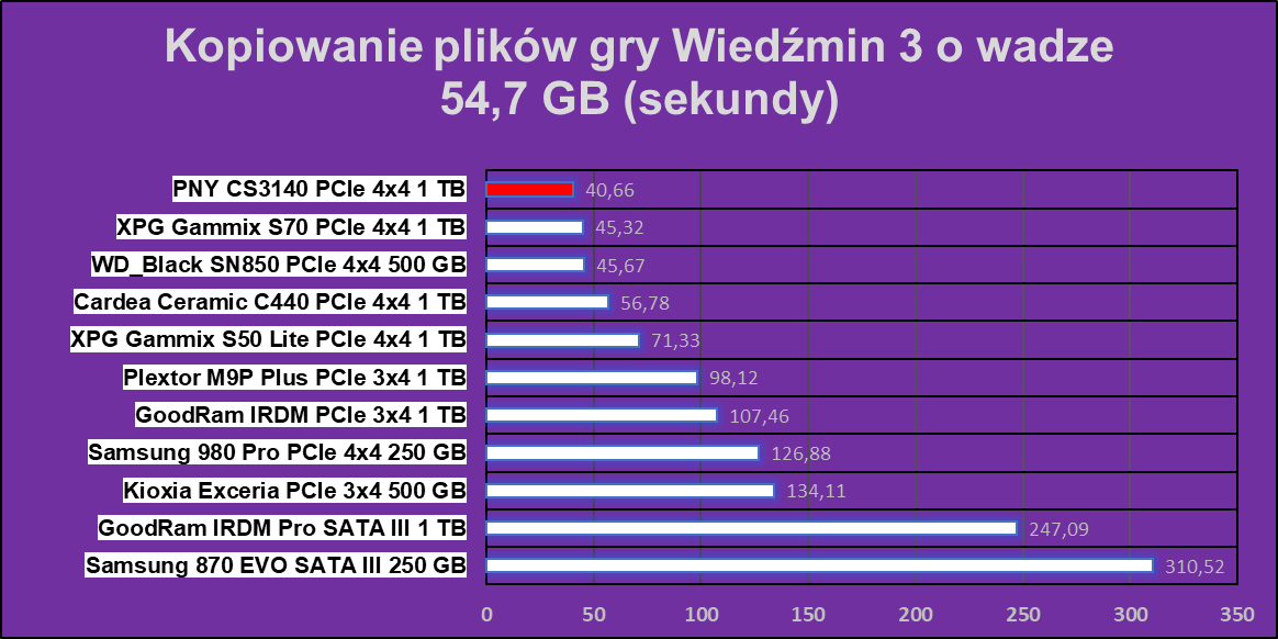 PNY XLR8 CS3140 1 TB jest idealnym przykładem dysku, w którym to wydajność w testach syntetycznych bezpośrednio przekłada się na zabawę z przenoszeniem plików. Model ten okazał się najwydajniejszym dyskiem w naszym zestawieniu, przegrywając tylko w kopiowaniu pliku ISO i usuwaniu plików Steam. Te wartości idealnie pokazują, że odpowiednio pojemne dyski na PCIe 4.0 mają znaczącą przewagę nad tymi na PCIe 3.0.