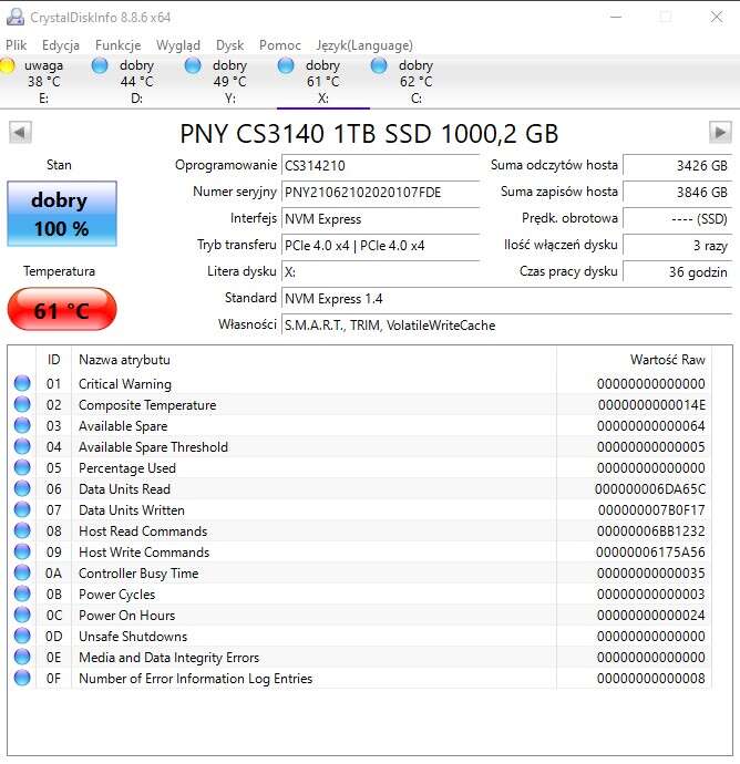 Jak już wspominałem, nie spotkałem się jeszcze z dyskiem PCIe 4.0, który bez chłodzenia nie miałby problemu z temperaturami. Dlatego właśnie PNY XLR8 CS3140 1 TB został przetestowany z wykorzystaniem chłodzenia z płyty głównej, które utrzymało temperatury na poziomie około 61 stopni Celsjusza nawet przy znaczącym obciążeniu.