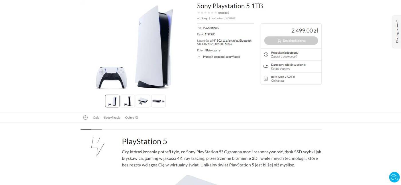Na wypadek gdyby ofertę usunięto – udostępniamy grafikę ze strony, która aktualnie dostępna jest pod tym linkiem. Cena PS5 w Polsce w sklepie X-KOM została ustanowiona na 2499 złotych.