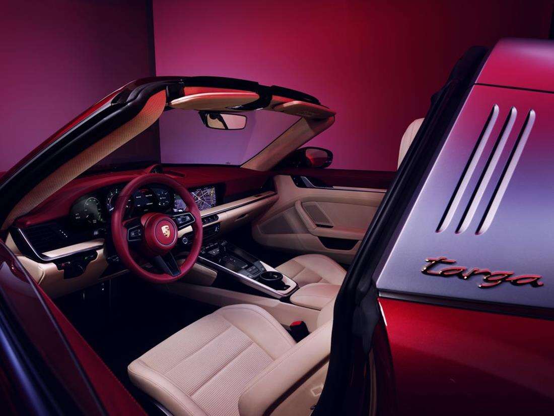 911 Targa 4S pokazany tutaj w ekskluzywnej farbie Cherry Metallic, może przybrać też inne barwy w wydaniu Heritage Design Edition. Jest bowiem dostępny w kolorze czarnym, czerwonym Guards i srebrnym kolorze GT. Te barwy przecinają paski ciągnące się za przednimi światłami oraz panelach bocznych, gdzie znalazły się także okrągłe naklejki tuż nad napisem Porsche.