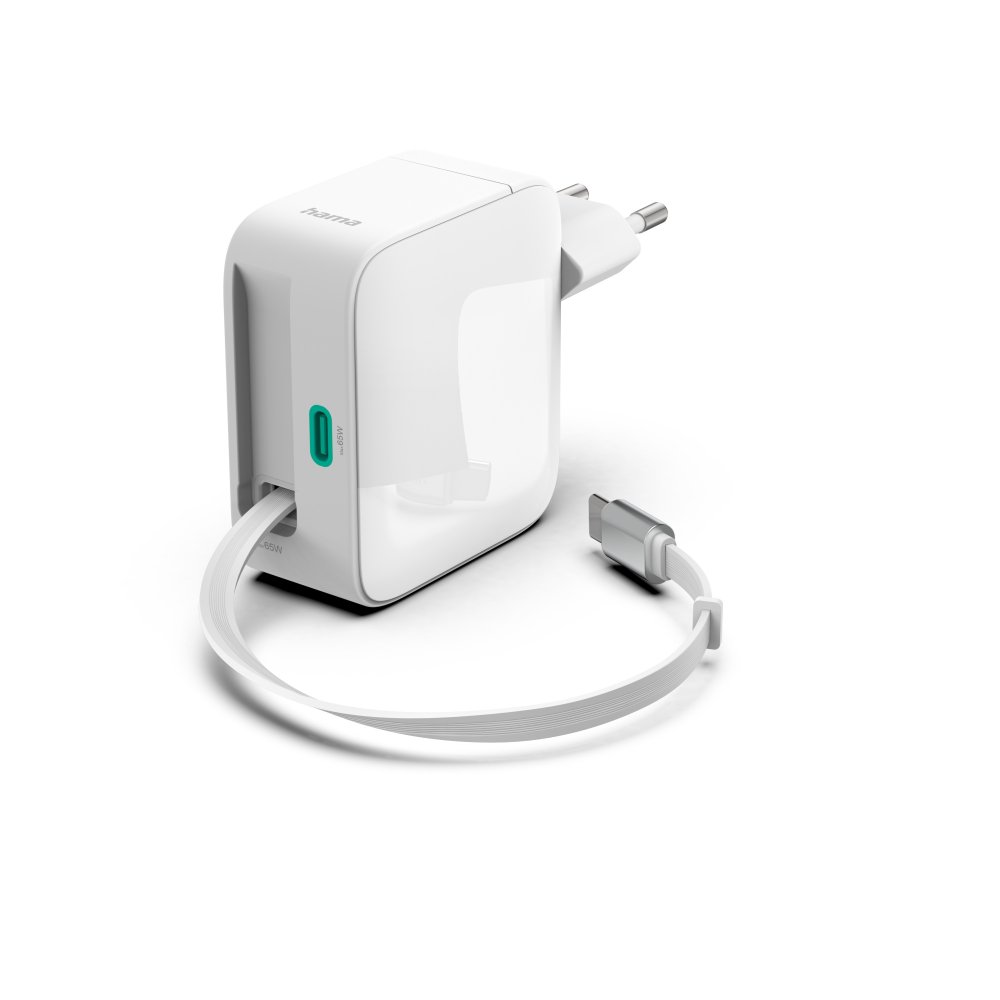 Co jednak najbardziej wyróżnia ładowarkę Hama Gan 65 W na tle konkurencyjnych konstrukcji? Dysponuje ona… wbudowanym zwijanym kablem o długości 70 cm z obustronną wtyczką USB-C. Kabel wystarczy zdecydowanym pociągnięciem wyciągnąć i podpiąć do urządzenia docelowego. Natomiast po zakończonym procesie zasilania energią trzeba go odpiąć i wypuścić, a zostanie automatycznie zwinięty do obudowy ładowarki. W ten sposób rozwiązuje się kilka problemów naraz, np. konieczność zabierania ze sobą osobno przewodu do ładowania czy upychania go wielokrotnie zgiętego do wąskich przestrzeni w bagażu. Zapomnijmy też o ryzyku jego zgubienia, gdyż jest na stałe przytroczony do zasilacza.