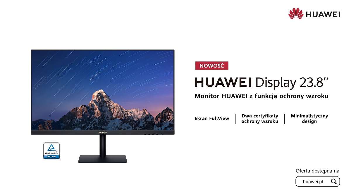Huawei wprowadza na nasz rynek pierwszy monitor. Huawei Display 23.8” jest kompaktowy, bo wyświetlacz ma przekątną jedynie 23.8 cala. Matryca Full HD (1920×1080 i ultracienkie ramki 5,7 mm pozwolą na wygodną pracę. Monitor wyposażono w wysoki współczynnik kontrastu 1000:1 i odwzorowanie przestrzeni barw NTSC na poziomie 72%. Dzięki temu oglądane treści będą bardzo dobrej jakości.