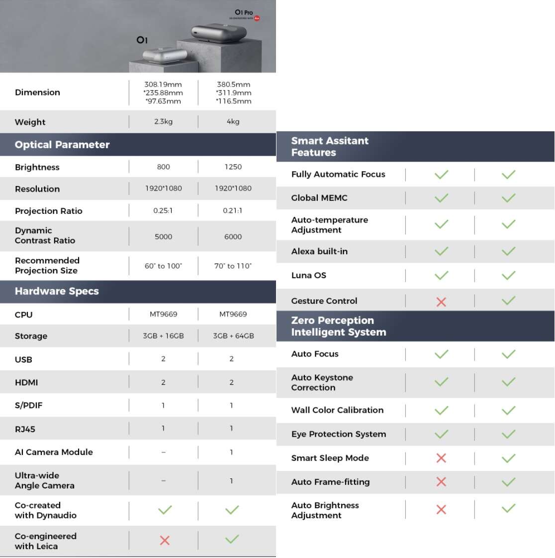 Chociaż oba projektory O1 mają ze sobą wiele wspólnego pod kątem specyfikacji, wydanie „nie Pro” jest oczywiście stosownie okrojone i to nie tylko ze sprzętu od Leica, ale też ogólnych możliwości i kilku „wodotryskowych” funkcji.